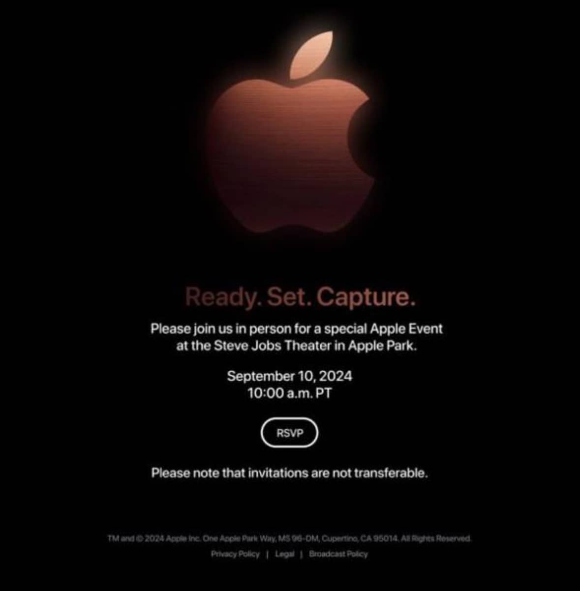 Судячи з них, захід пройде під заголовком «Ready. Set. Capture», що натякає на нову кнопку для камери в iPhone 16 Pro. Час початку вказано 10 вересня, 20:00 за Києвом.