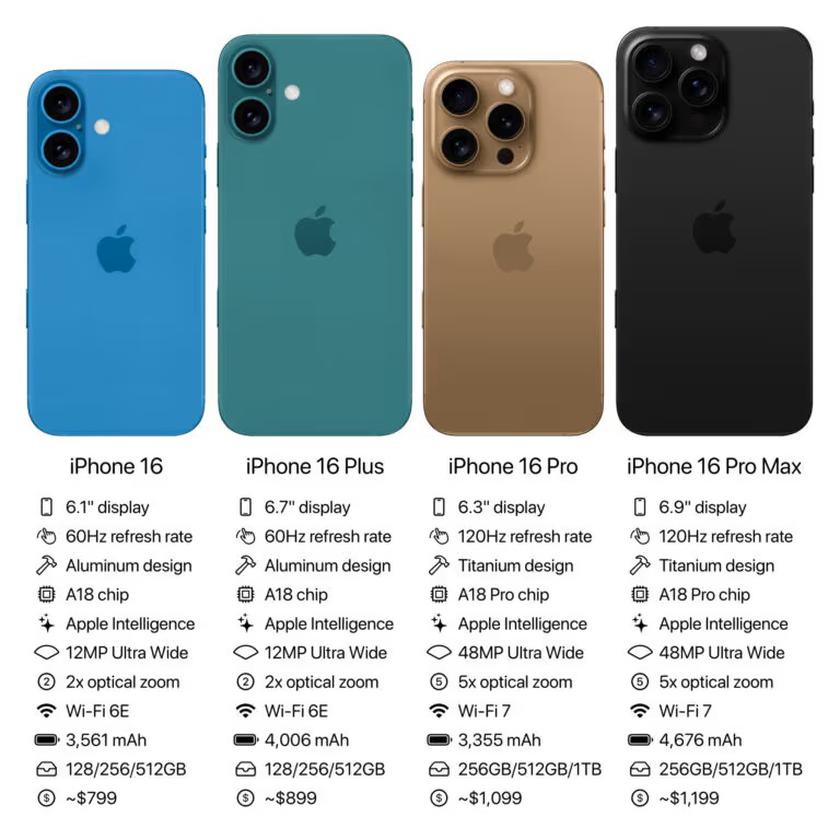 Останній витік розкриває безліч деталей про смартфони iPhone 16, iPhone 16 Plus, iPhone 16 Pro та iPhone 16 Pro Max, включаючи технічні характеристики та передбачувані ціни в США.