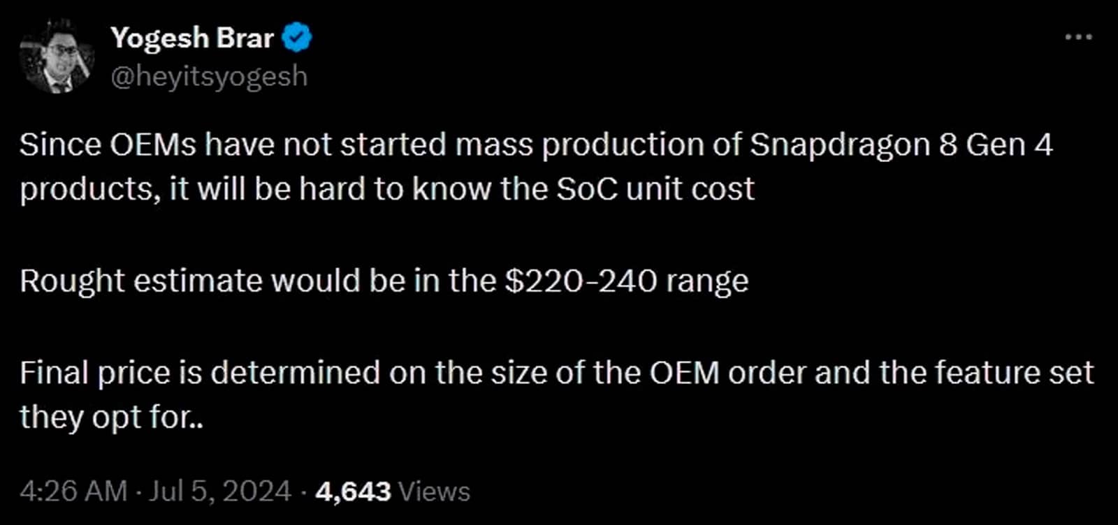 Що стосується підвищення ціни на Snapdragon 8 Gen 4, то на це вплинуло два факти. По-перше, Qualcomm планує використовувати для виробництва нового чипа 3-нм техпроцес TSMC під назвою "N3E". Це покращена технологія виробництва мікросхем щодо базового «N3», яка була впроваджена близько 1 року тому. Другий момент пов'язаний із фірмовими ядрами Oryon — Qualcomm відмовилася від розробок ARM і спроєктувала топове ядро власноруч, тому компанії необхідно покрити відповідні витрати.