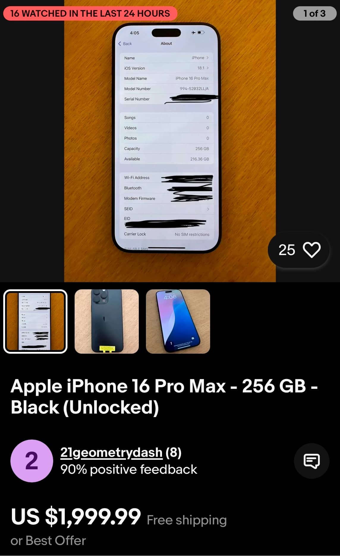 ЗМІ виявили на майданчику eBay чорний iPhone 16 Pro Max у версії на 256 ГБ. Лот виставлено за $1999,99. Повідомляється, що це передрелізний прототип.