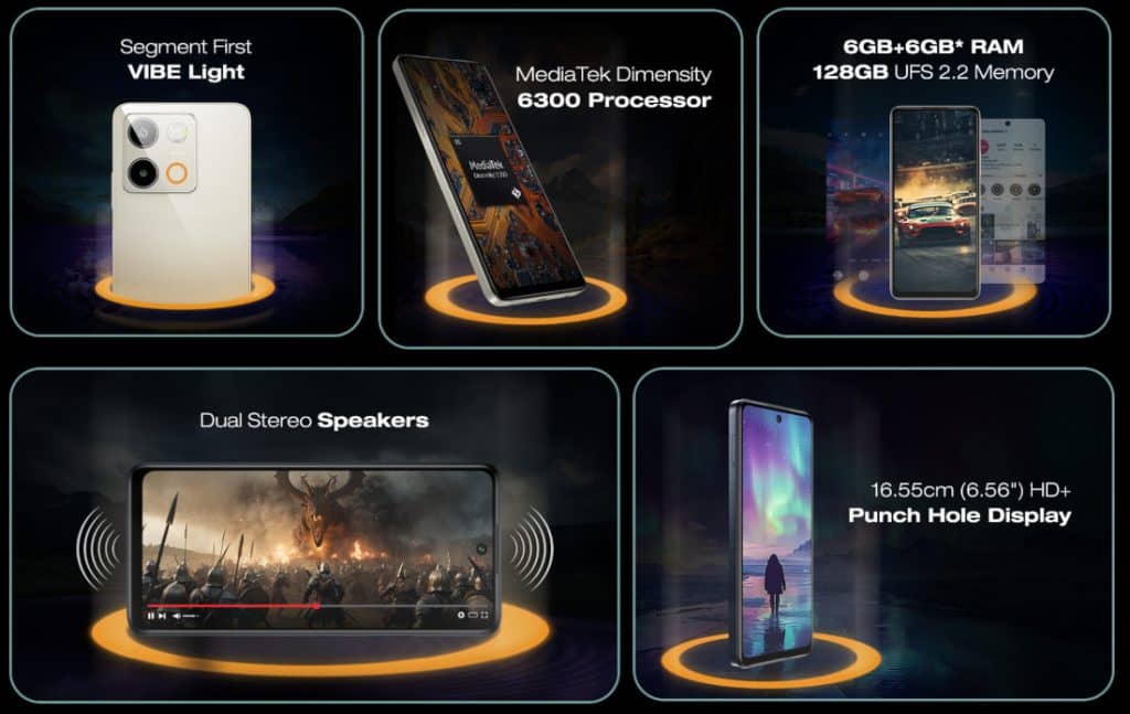 Lava Blaze 3 пропонує 6.5-дюймовий дисплей з роздільною здатністю HD+, частотою оновлення 90 Гц, процесор MediaTek Dimensity 6300 з підтримкою 5G, 6 ГБ оперативної пам'яті, 128 ГБ вбудованої пам'яті, до 6 ГБ віртуальної пам'яті.