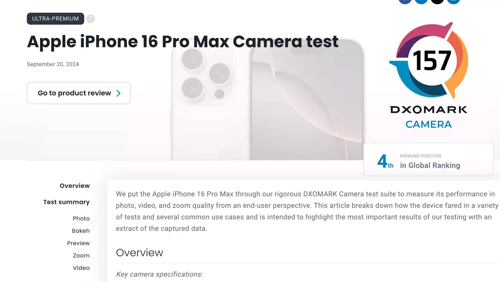 Флагманський смартфон Apple iPhone 16 Pro Max посів 4 місце в рейтингу камер DXOMark, набравши 157 балів.