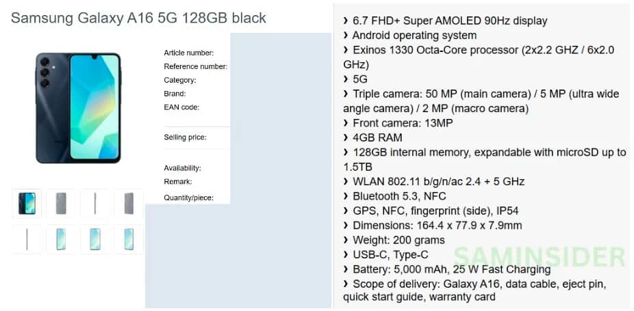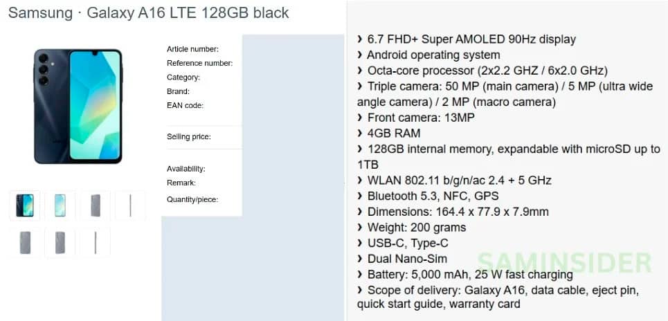 Galaxy A16 буде оснащено основною камерою на 50 Мп, ультраширококутною на 5 Мп та макрооб'єктивом на 2 Мп. Фронтальна камера отримає роздільну здатність 13 Мп. Пристрій повинен живити батарею ємністю 5000 мАг з зарядкою потужністю 25 Вт.