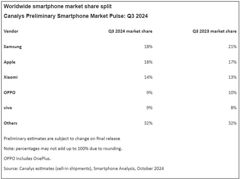 На третьому місці розташувалася Xiaomi з часткою 14% ринку, продемонструвавши також впевнене зростання. Компанія готується до посилення своїх позицій, запустивши серію Redmi Note 14 у Китаї та Xiaomi 14T у Європі, а найближчим часом на ринку з'явиться флагманська серія Xiaomi 15, що може збільшити її конкурентоспроможність у останньому кварталі року.