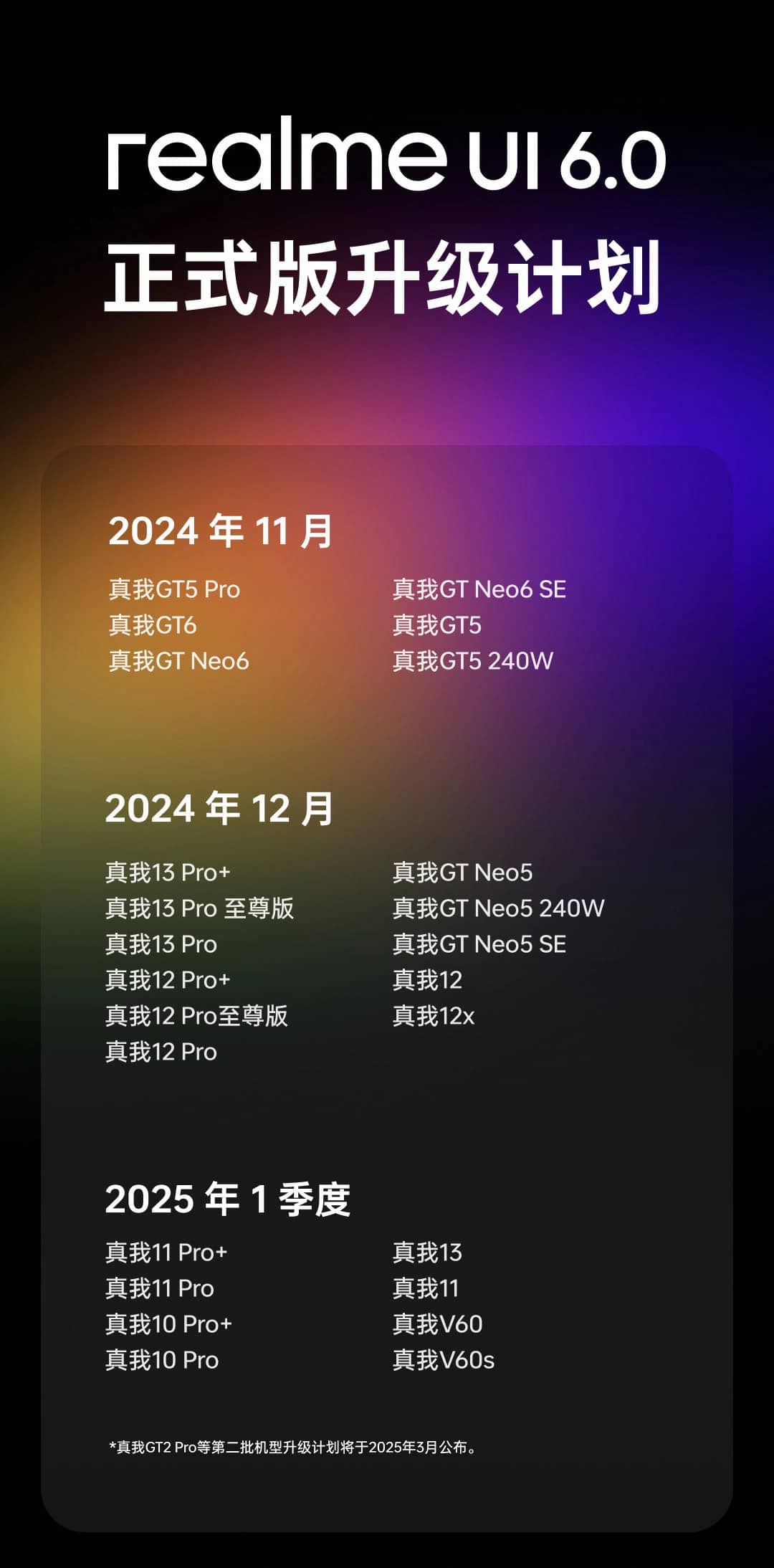 Під час першої хвилі у листопаді оновлення отримають смартфони лінійок Realme GT5, GT6 та GT Neo6. У грудні воно дістанеться Realme 13 Pro, 12 Pro, GT5 Neo і «народних» Realme 12 з 12x. У січні 2025 року апдейт буде доступний ще на кількох пристроях, у тому числі Realme 11 Pro, 10 Pro та V60.