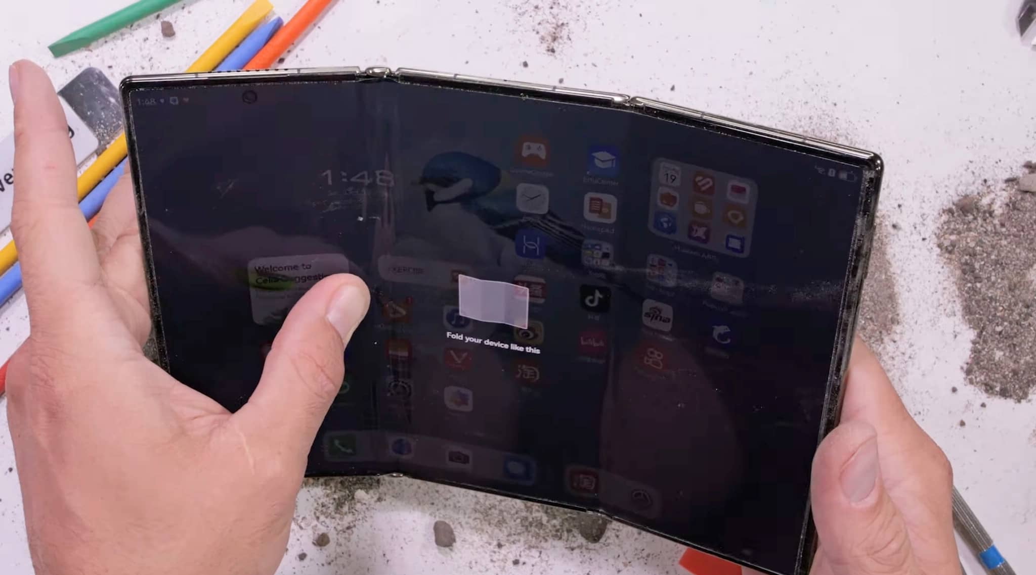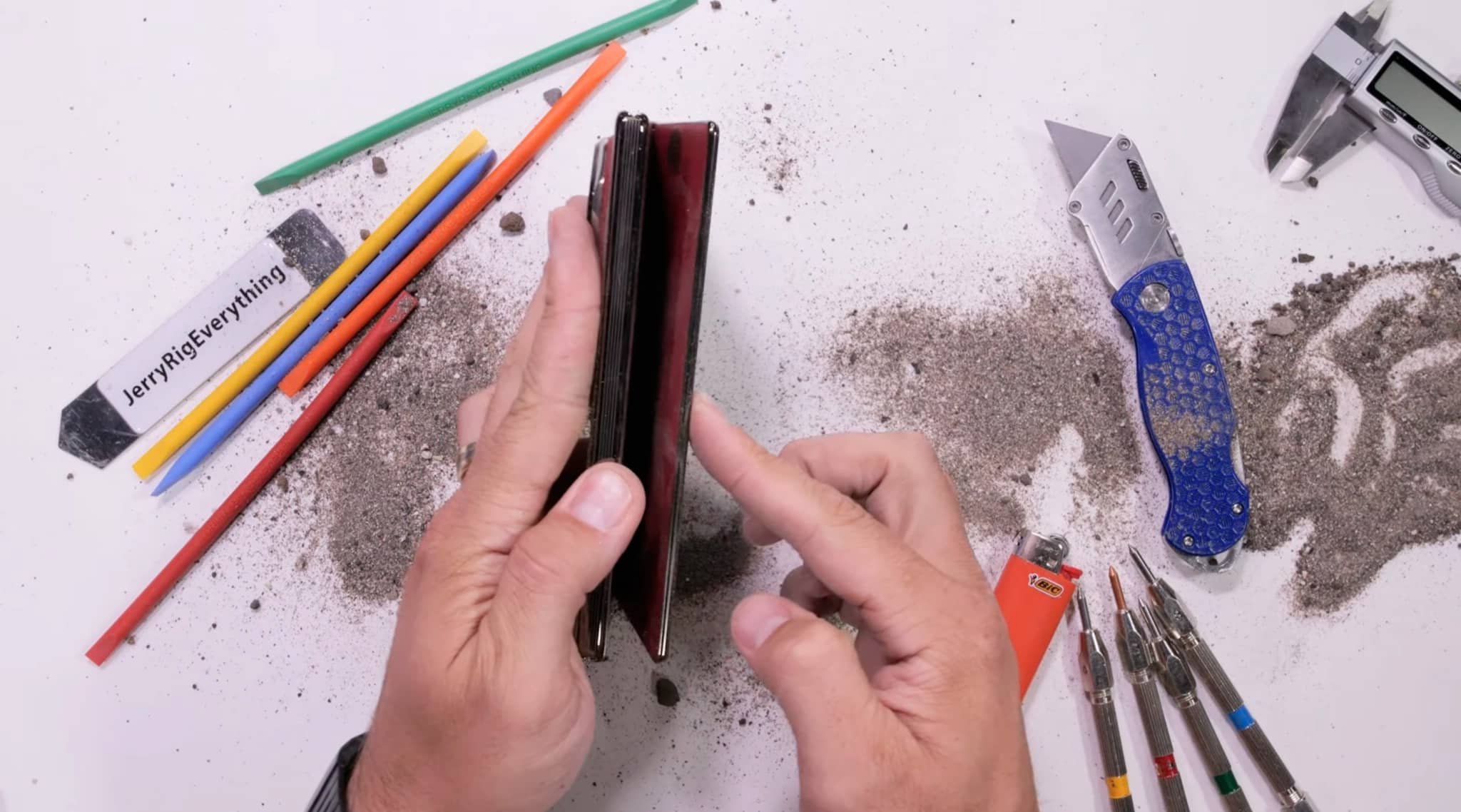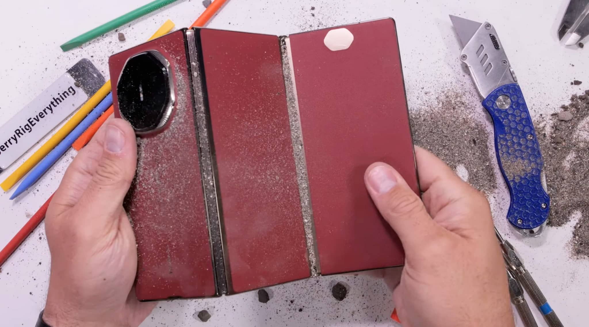 Новинка провалила тест і в ситуації, коли JerryRigEverything посипав задню панель пилом та піском. Після цього пристрій перестав нормально складатися.