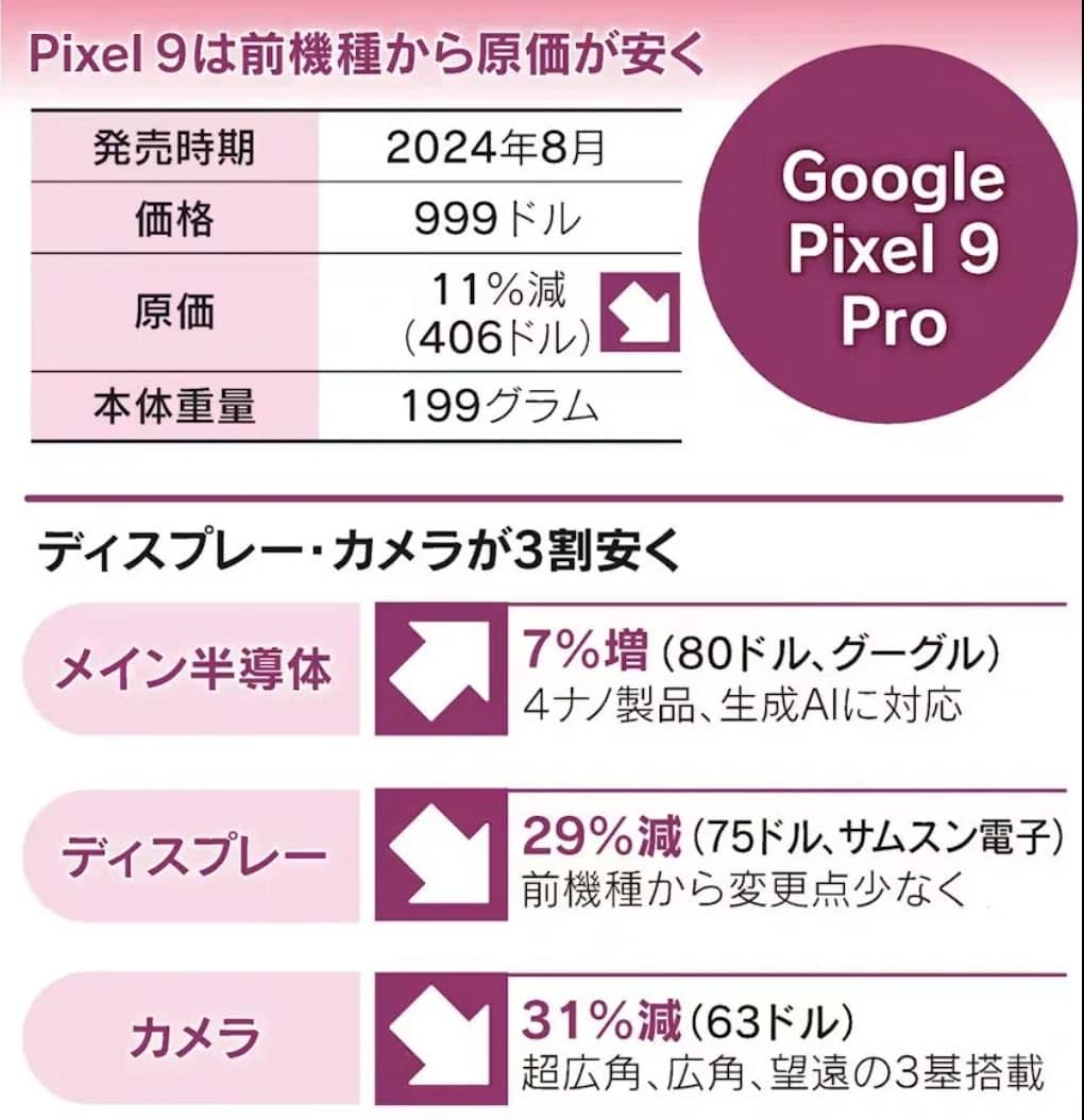Собівартість матеріалів для Pixel 9 Pro складає близько 406 доларів — пише видання 9to5Google, посилаючись на звіт Nikkei. Ця сума враховує лише вартість матеріалів — до неї не входять доставка, маркетинг тощо.