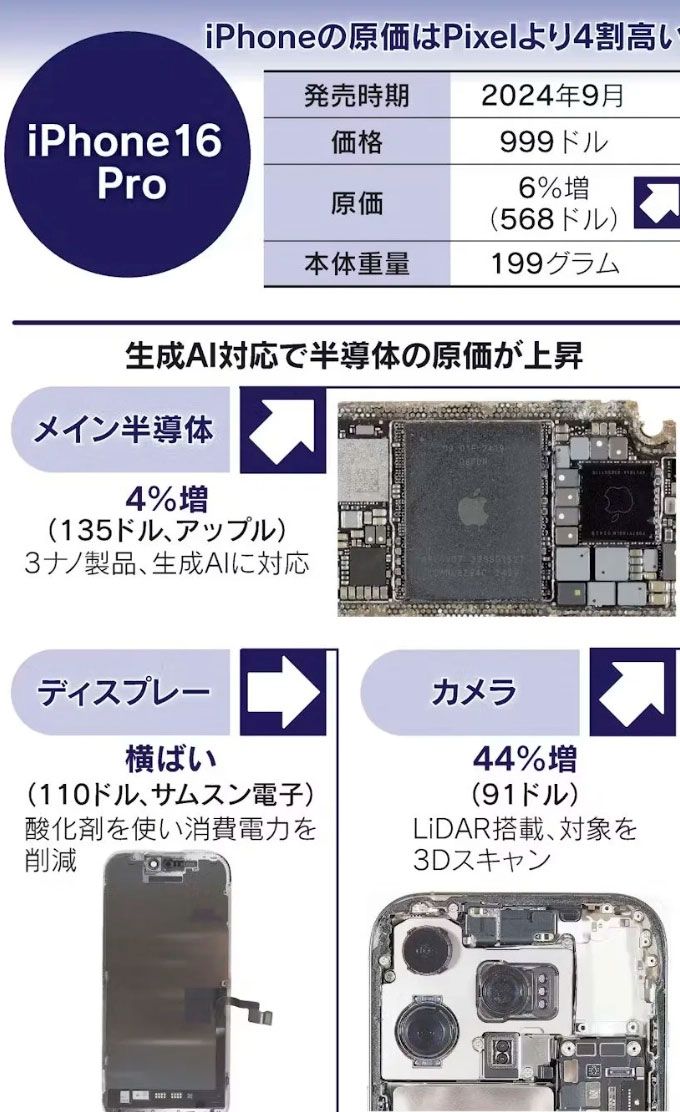 Таким чином, собівартість Pixel 9 Pro виявилася на ~11% нижчою, ніж у Pixel 8 Pro. У тому ж звіті Nikkey говориться, що вартість iPhone 16 Pro становить ~568 доларів, що трохи вище, ніж 15 Pro. Чип A18 Pro коштує 135 доларів, дисплей — 110 доларів, а компоненти камери — 91 долар.