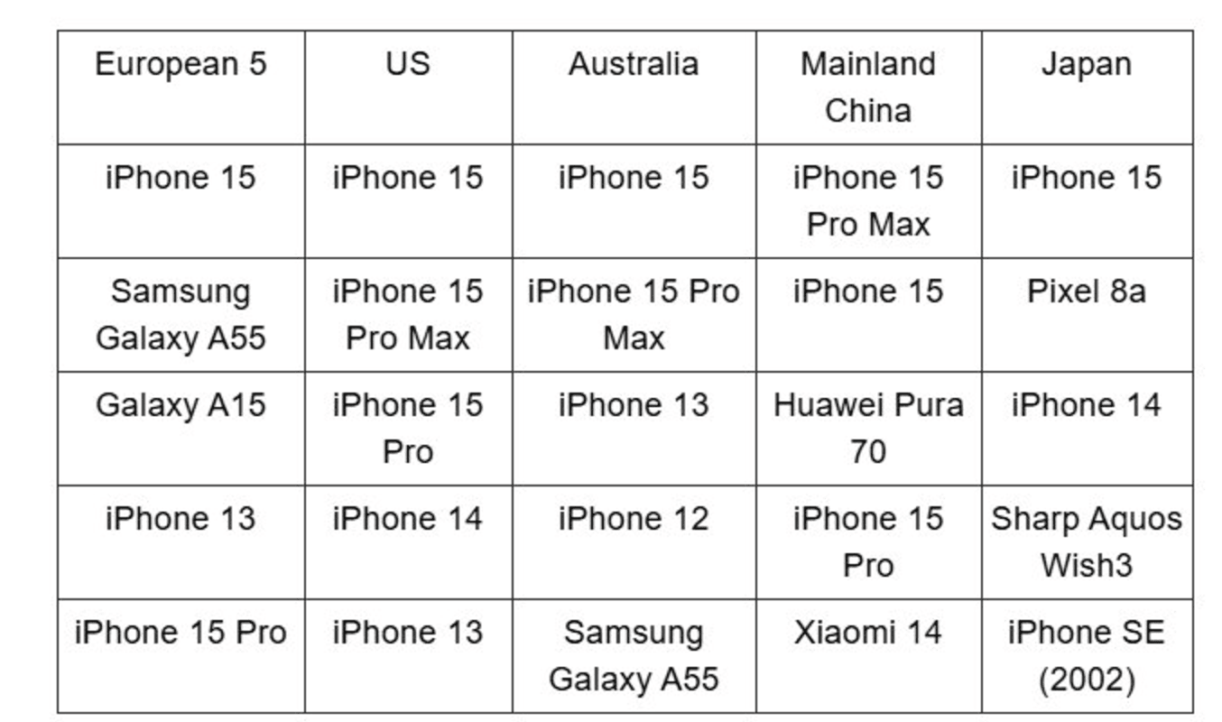 Абсолютним бестселером став базовий iPhone 15: його найчастіше купували у чотирьох із п'яти регіонів. Винятком став лише Китай, де топ очолив дорожчий та просунутий iPhone 15 Pro Max.