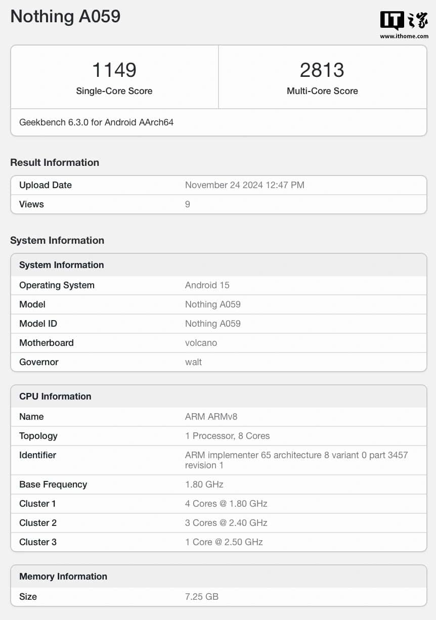 Модель має номер A059 та оснащується чипом Snapdragon 7s Gen 3, який доповнений 8 ГБ оперативної пам'яті. OC — Android 15. Смартфон набрав 1149 балів та 2813 балів у одноядерному та багатоядерному тестах.