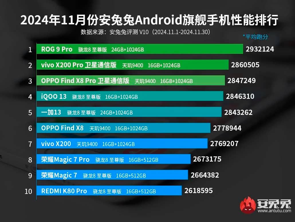 - Redmi K80 Pro на Snapdragon 8 Elite (16/512 ГБ) — 2 618 595 балів.