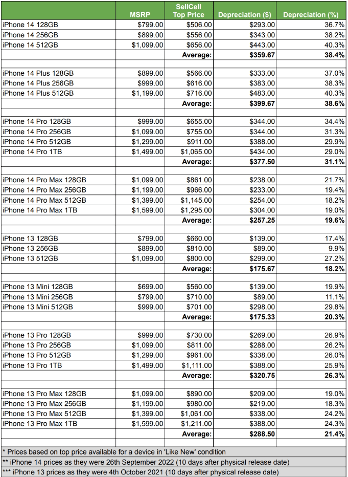 За даними джерела, через 10 днів після релізу iPhone 13 минулого року ціна базової версії смартфона на «вторинці» була на 18% меншою за номінальну — а ось iPhone 14 за той же час подешевшав на 38,4%. З іншими моделями нової серії 14 Pro справи трохи кращі: iPhone 14 Pro впав у ціні на 31,1%, а Pro Max — на 19,6% проти 26,3% і 21,4% у попередників.