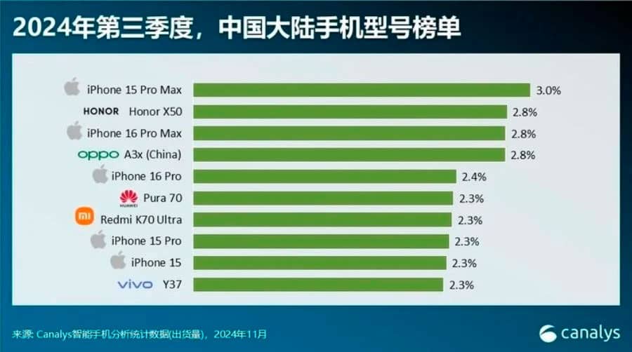 Honor X50 також випередив інші преміальні пристрої, такі як Redmi K70 Ultra. iPhone 15 Pro Max залишається найпопулярнішим пристроєм у Китаї, займаючи 3% ринку, інші бюджетні моделі, такі як Vivo Y37 і Oppo A3x, завершують топ-10.