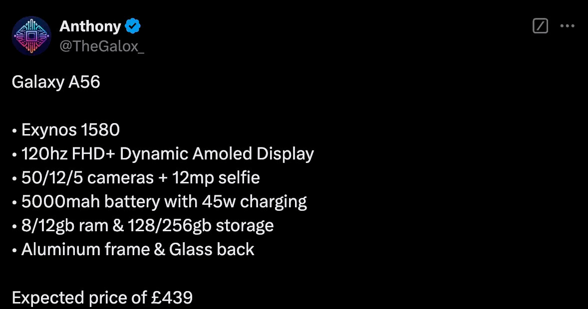 Очікувана ціна становить £439. Зазначимо, що Galaxy A56 може стати привабливим варіантом для тих, хто шукає потужний та стильний смартфон за доступною ціною.