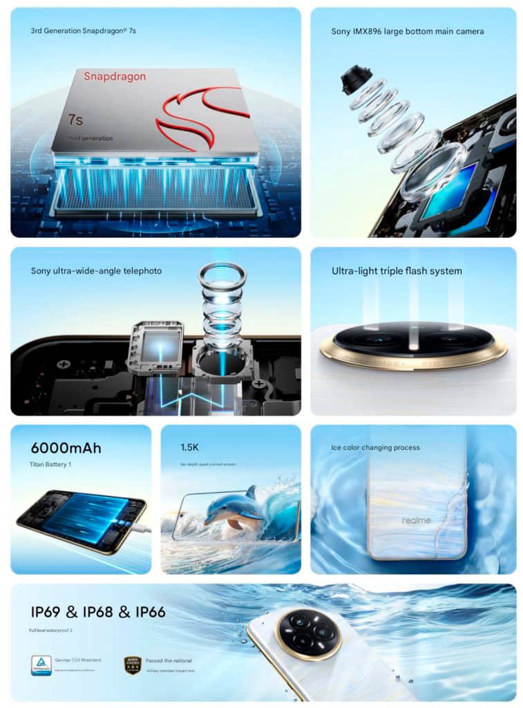 Realme 14 Pro+ отримав чипсет Snapdragon 7s Gen 3, 12 ГБ оперативної пам'яті, 256/512 ГБ вбудованої пам'яті, акумулятор ємністю 6000 мАг з зарядкою потужністю 80 Вт.