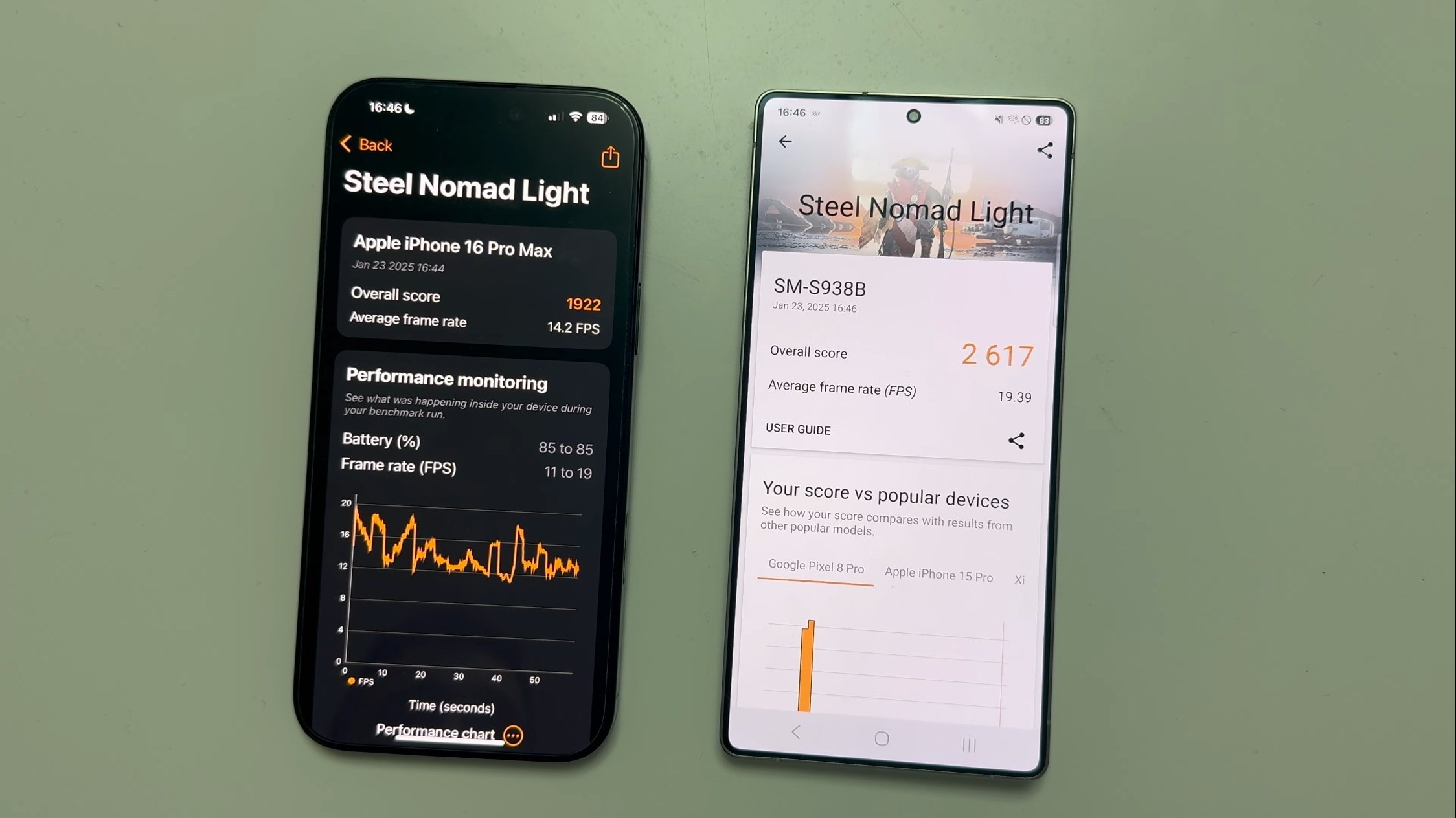 У цьому тесті Galaxy S25 Ultra, оснащений Snapdragon 8 Elite, набрав 2617 балів проти 1922 року в iPhone 16 Pro Max з чипом A18 Pro. Середній FPS становив 19.39 у Galaxy і 14.2 в iPhone, що підтверджує 36% переваги нового GPU Adreno.