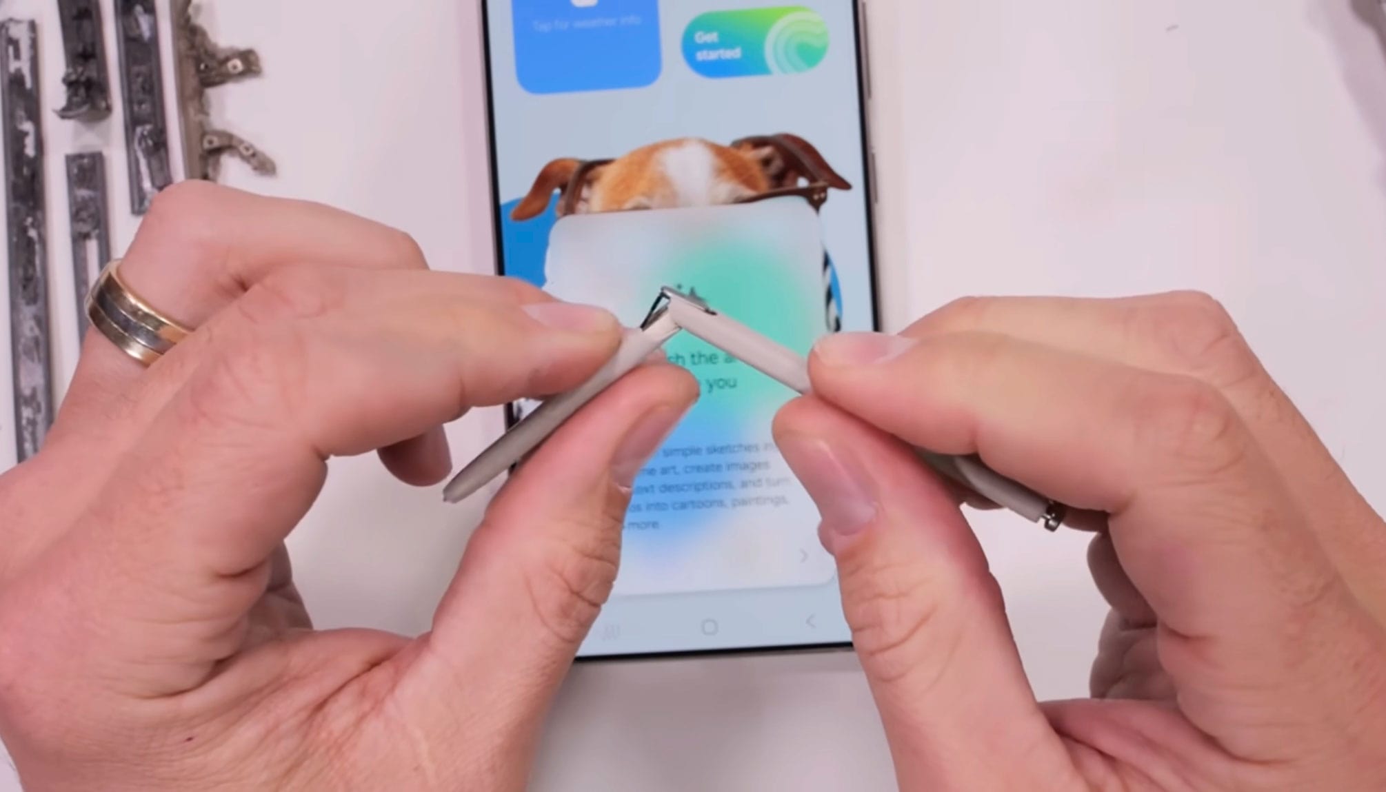 Насамперед Зак Нельсон зламав S Pen навпіл — прикладати зусилля не довелося, «перо» ламається легко. Внутрішній пристрій стілусу цього року відрізняється — це пов'язано з відсутністю підтримки Bluetooth, яка була в S Pen минулих поколінь.