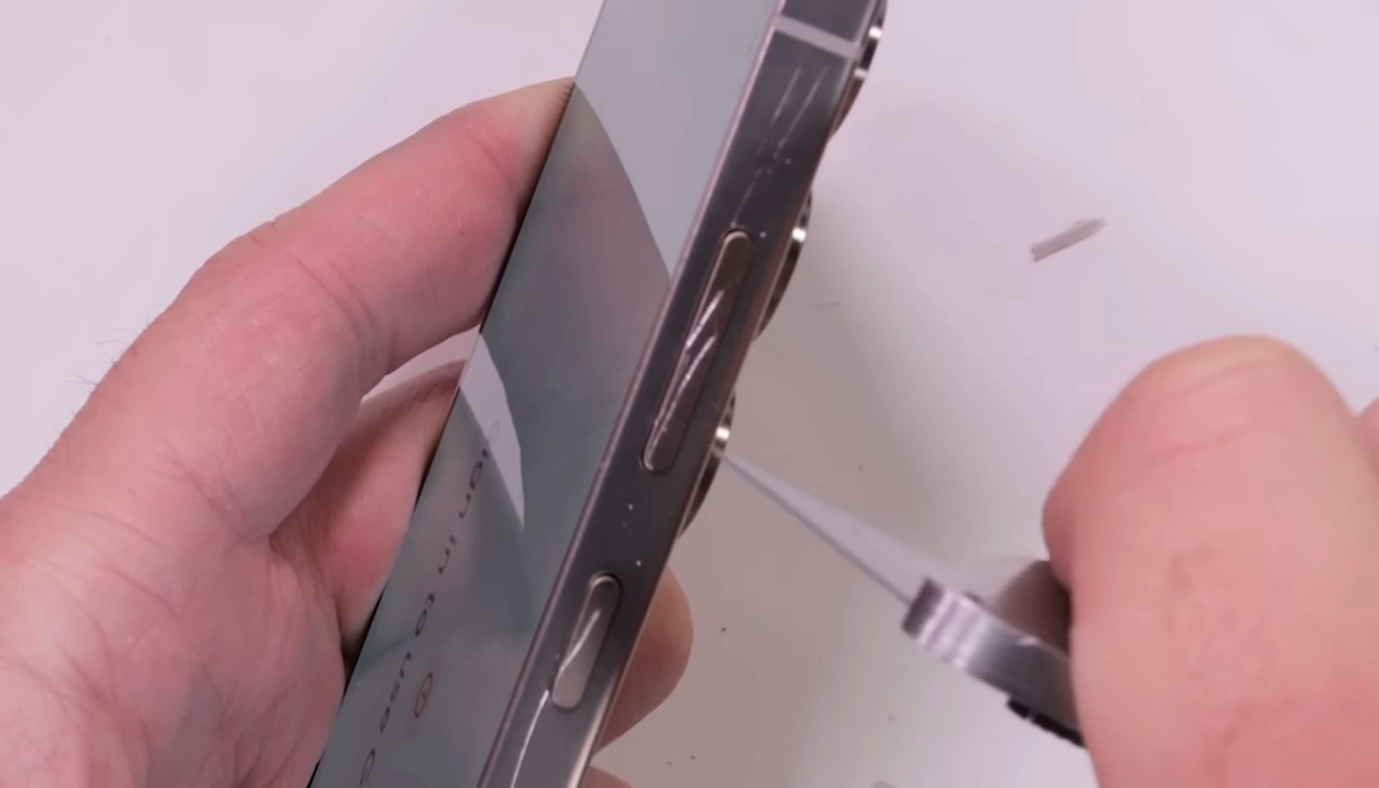 Далі блогер почав дряпати екран та бічні грані смартфона. Найлегше дряпаються кнопки, складніше було подряпати титанові грані, і ще складніше — екран зі склом Corning Gorilla Armor 2.