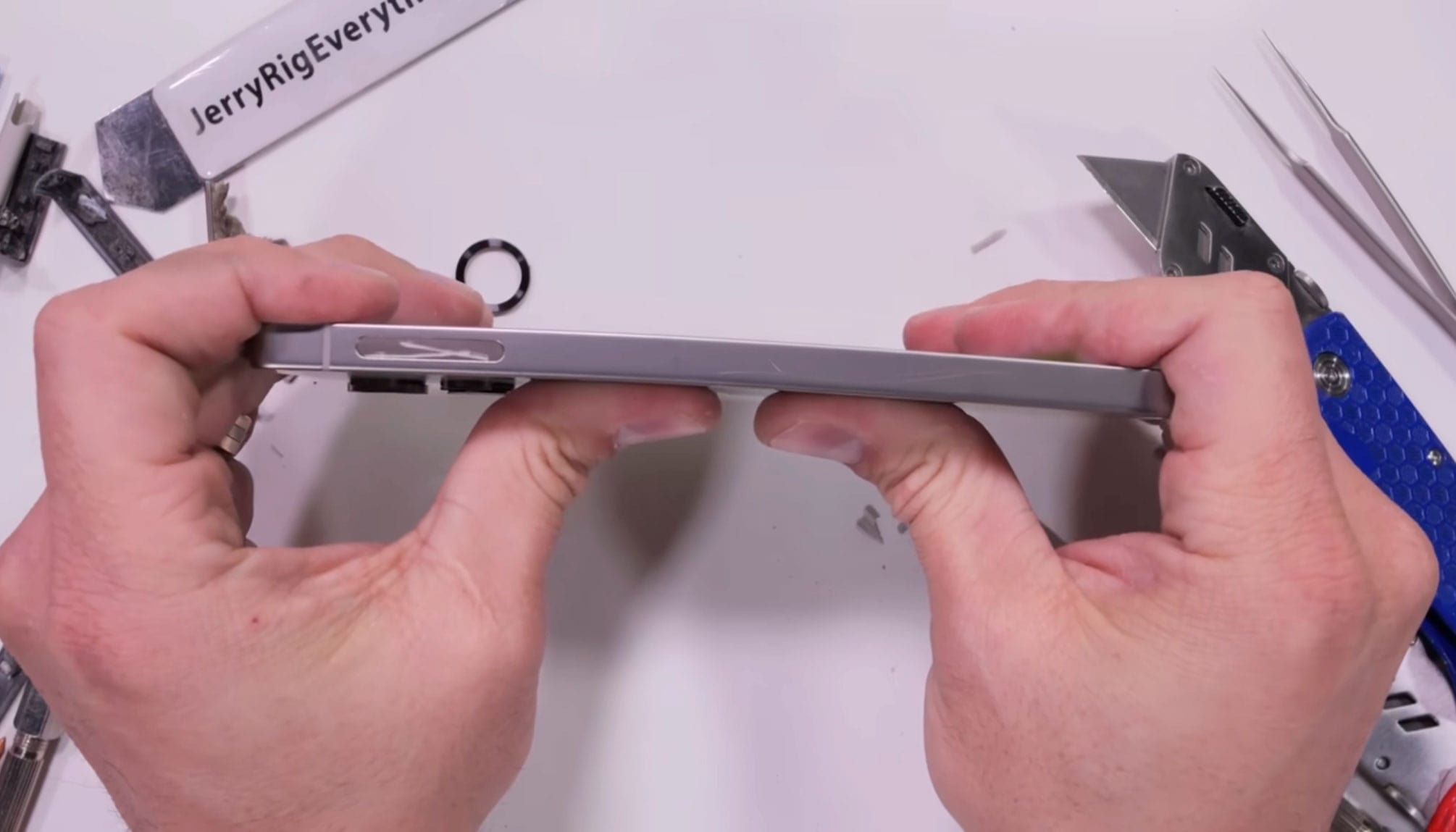 Останнім тестом стала спроба блогера зігнути флагман — не вийшло. Те саме було з S24 Ultra — при спробі зігнути смартфон в будь-яку сторону, його корпус трохи піддається, але ніяких деформацій або тріщин не з'являється.