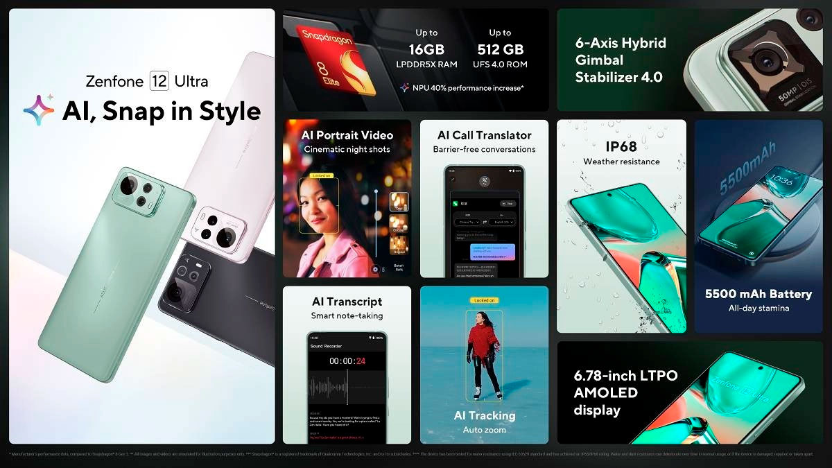 Однією із ключових особливостей Zenfone 12 Ultra став штучний інтелект. Локальна модель Meta Llama 3 8B дозволяє швидко обробляти текстові дані, а функція AI Call Translator 2.0 виконує переклад дзвінків у реальному часі, причому не лише у стандартному застосунку телефона, а й у дзвінках через месенджери. Програма Recorder з AI Transcript 2.0 вміє автоматично розшифровувати розмови, розрізняючи голоси співрозмовників, створювати текстові зведення та перекладати їх.
