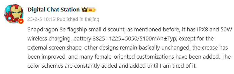 Очікується, що Mix Flip 2 працюватиме на чипсеті Snapdragon 8 Elite, що може зробити його першим смартфоном-розкладачкою з цим процесором. За чутками, Xiaomi також покращить зовнішній екран і зменшить складку, телефон також матиме клас водонепроникності IPX8, чого не вистачало його попереднику.