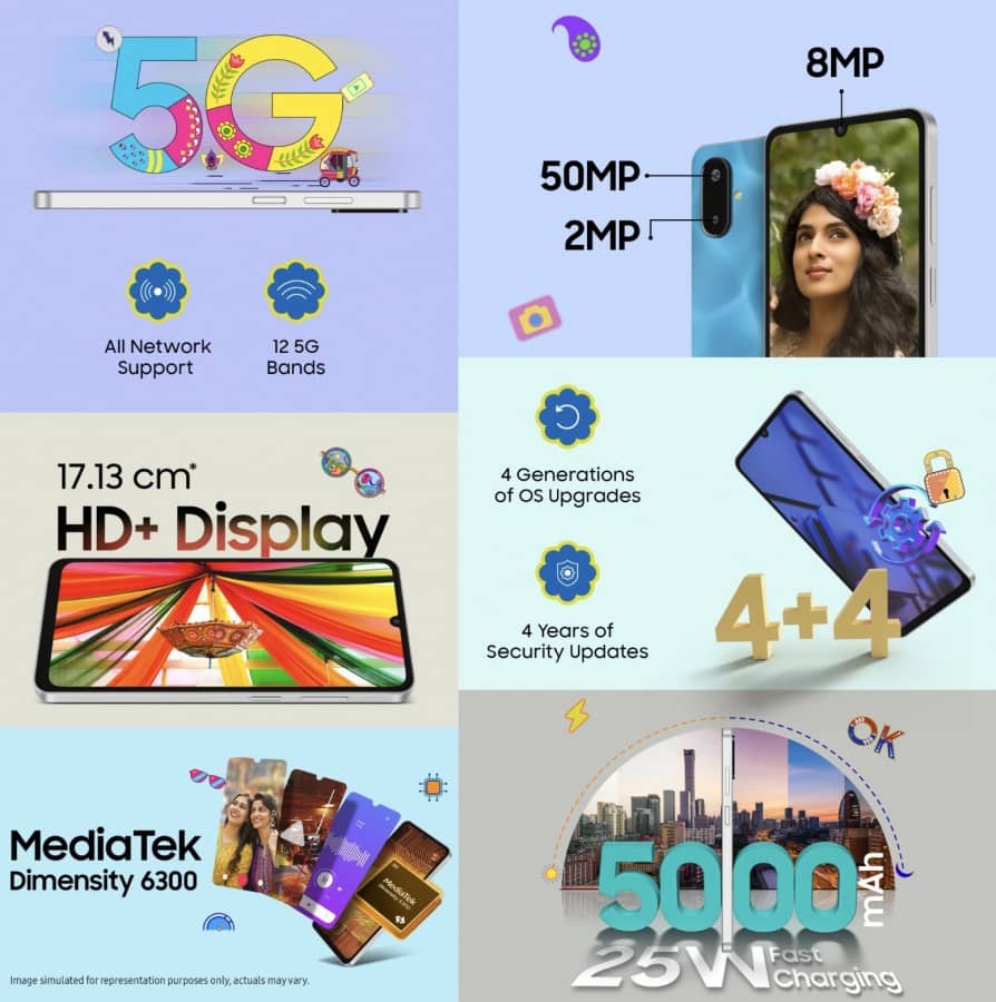 Новинка має схожі характеристики з Galaxy A06, за винятком ключової відмінності — процесора. Він оснащений чипсетом MediaTek Dimensity 6300, який забезпечує повну підтримку 5G для всіх дванадцяти частотних діапазонів 5G, що використовуються в Індії.