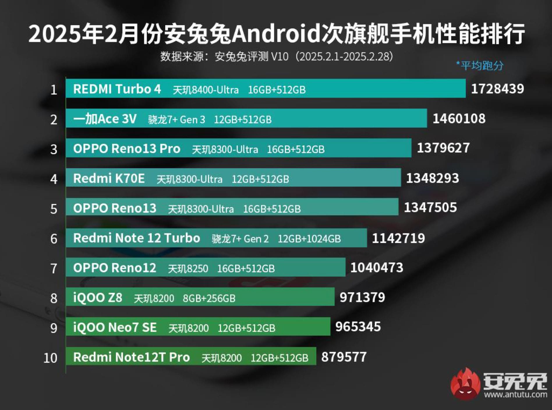 Бенчмарк AnTuTu представив лютневий рейтинг найпотужніших смартфонів середнього класу. Лідером знову став Redmi Turbo 4 із процесором Dimensity 8400-Ultra, який очолював січневий список. Однак цього разу його середній результат виявився трохи меншим — 1 728 439 балів.