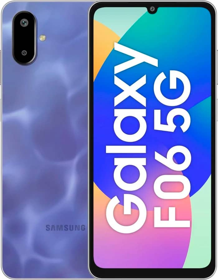 Galaxy F06 5G доступний у кольорах Bahama Blue та Lit Violet. У нього є 8-Мп фронтальна камера, основна камера з 50-Мп та 2-Мп датчиками, слот для карт microSD, гібридний SIM-лоток, бічний сканер відбитків пальців, роз'єм для навушників 3.5 мм та легкий дизайн з вагою 191 грам.