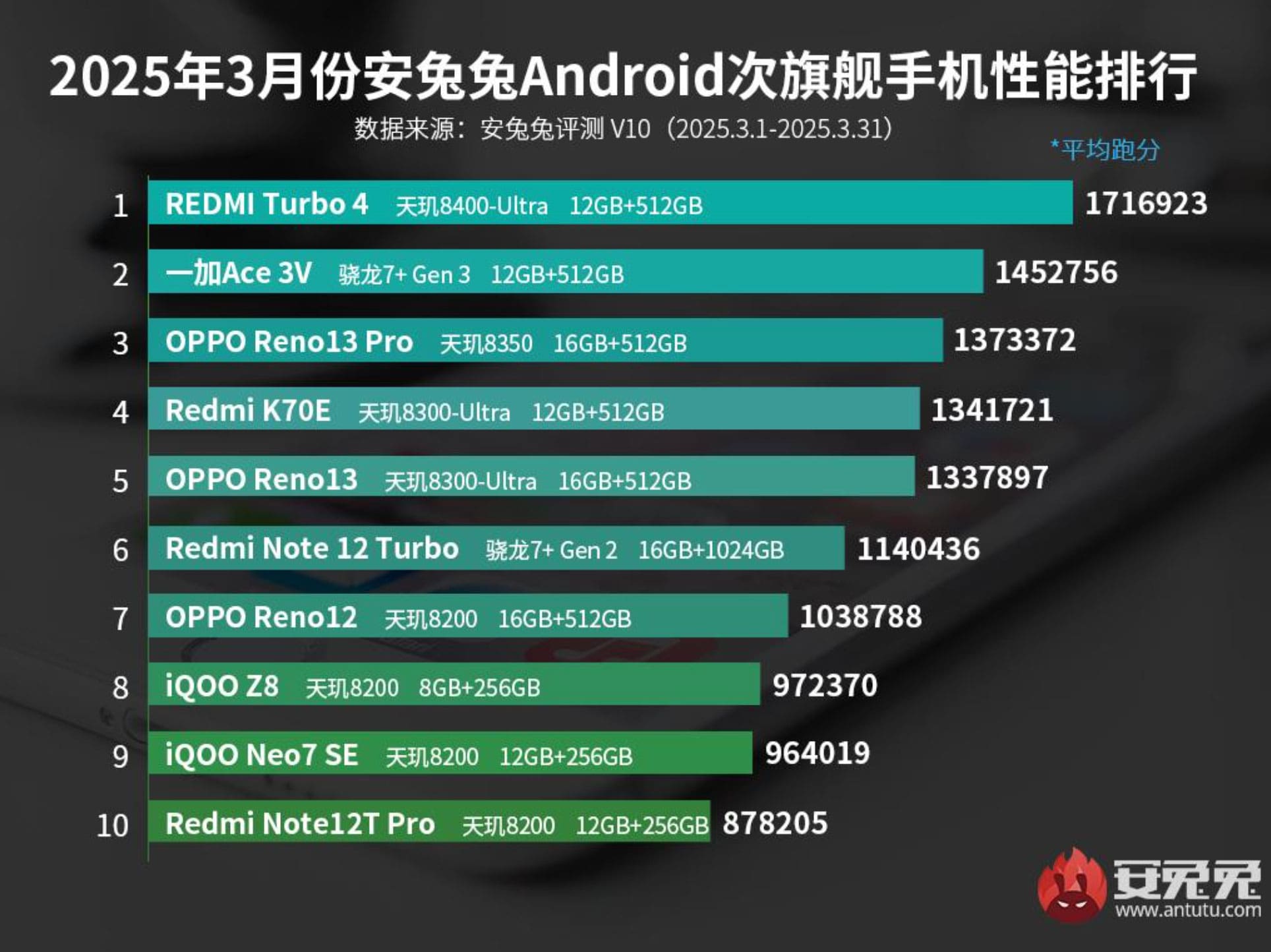 Лідером березня став Redmi Turbo 4 з чипсетом MediaTek Dimensity 8400-Ultra, який набрав вражаючі 1 716 923 бали за результатами всіх тестів.