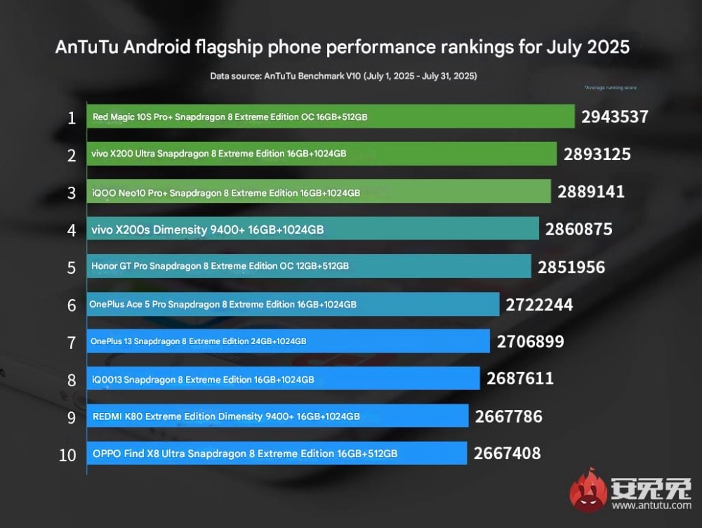 Оновився щомісячний китайський рейтинг продуктивності смартфонів AnTuTu.