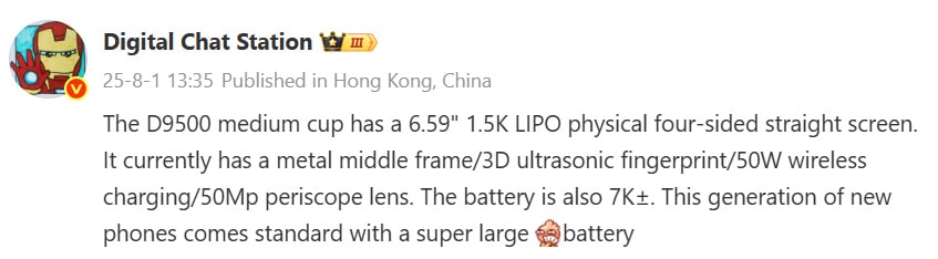 Однією з головних особливостей стане велика батарея на 7000 мАг. Поки невідомо, з якою потужністю буде дротова зарядка, але підтримка бездротової зарядки на 50 Вт підтверджена. Основна камера отримає 50-мегапіксельний перископічний об'єктив.