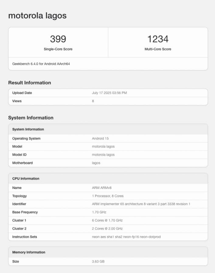 У базі Geekbench модель вказана під кодовою назвою lagos. Зважаючи на все, Moto G06 працює на чипсеті MediaTek Helio G81 Extreme і оснащений 4 ГБ оперативної пам'яті. Також підтверджено, що смартфон поставлятиметься з попередньо встановленою операційною системою Android 15.