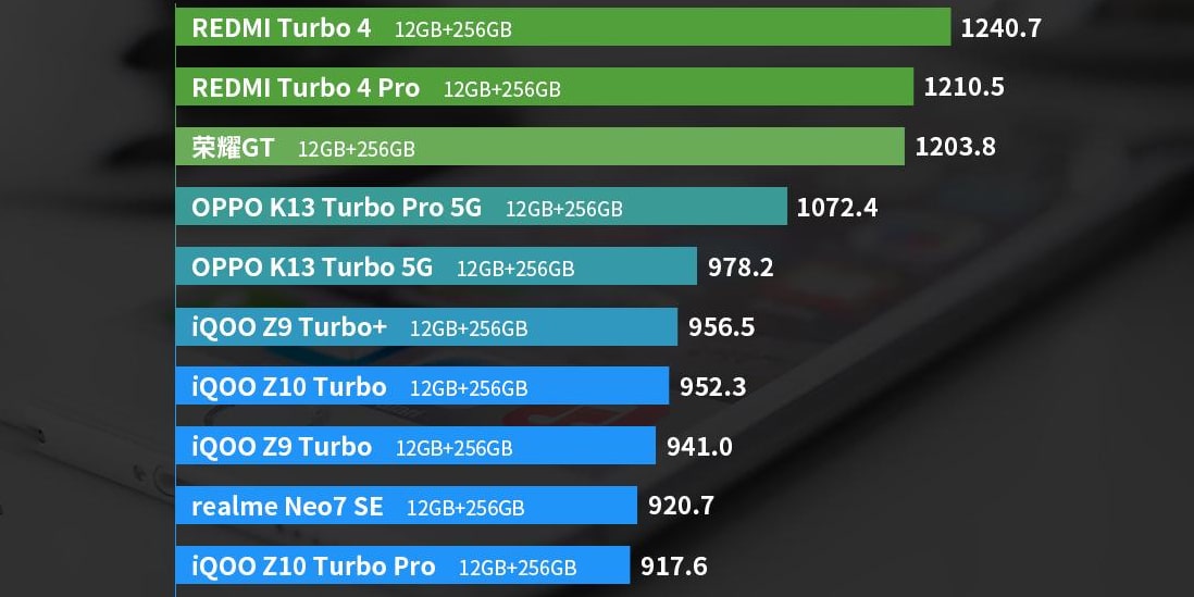Лідером середнього сегмента став Redmi Turbo 4 із чипом Dimensity 8400 Ultra – перший смартфон на цій платформі. На другому місці розташувався Redmi Turbo 4 Pro із Snapdragon 8s Gen 4, а замикає трійку Honor GT на базі Snapdragon 8 Gen 3.