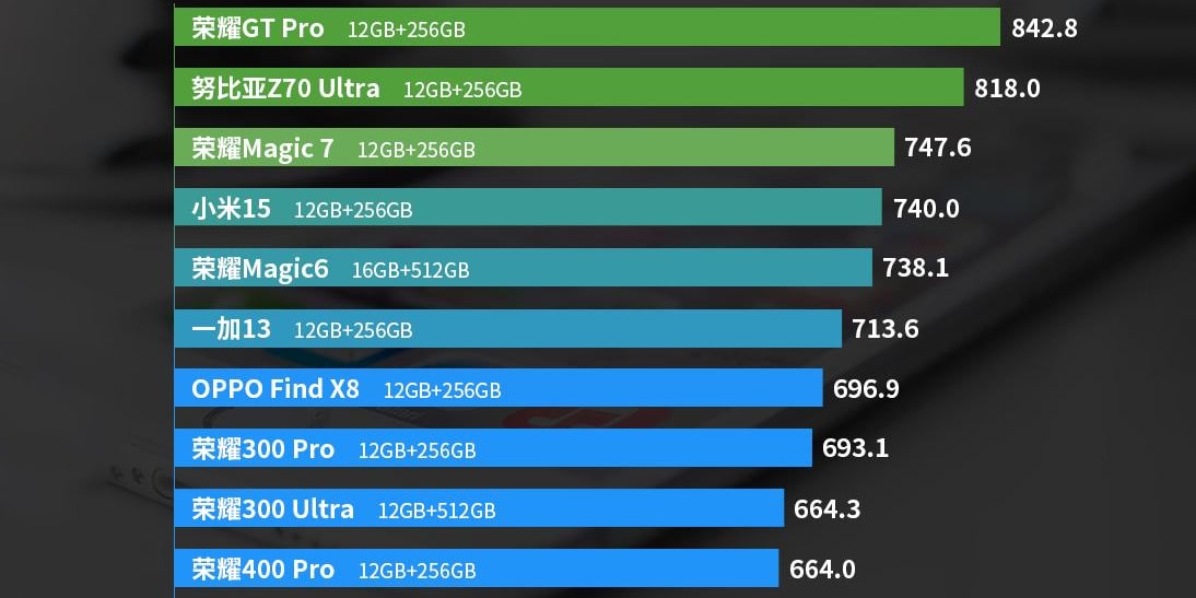 Трійка лідерів складається з Honor GT Pro, Nubia Z70 Ultra та Honor Magic 7 — всі три оснащені топовим чипом Snapdragon 8 Elite.