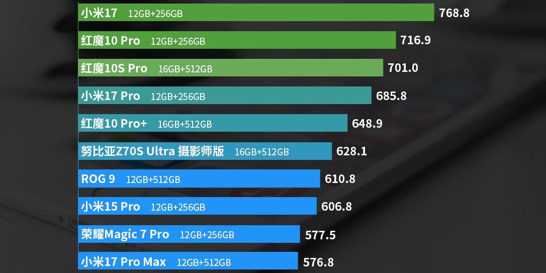 Серед преміальних моделей чемпіоном став Xiaomi 17 з найновішим Snapdragon 8 Elite Gen 5. За ним слідують Red Magic 10 Pro та Red Magic 10S Pro, які працюють на Snapdragon 8 Elite.