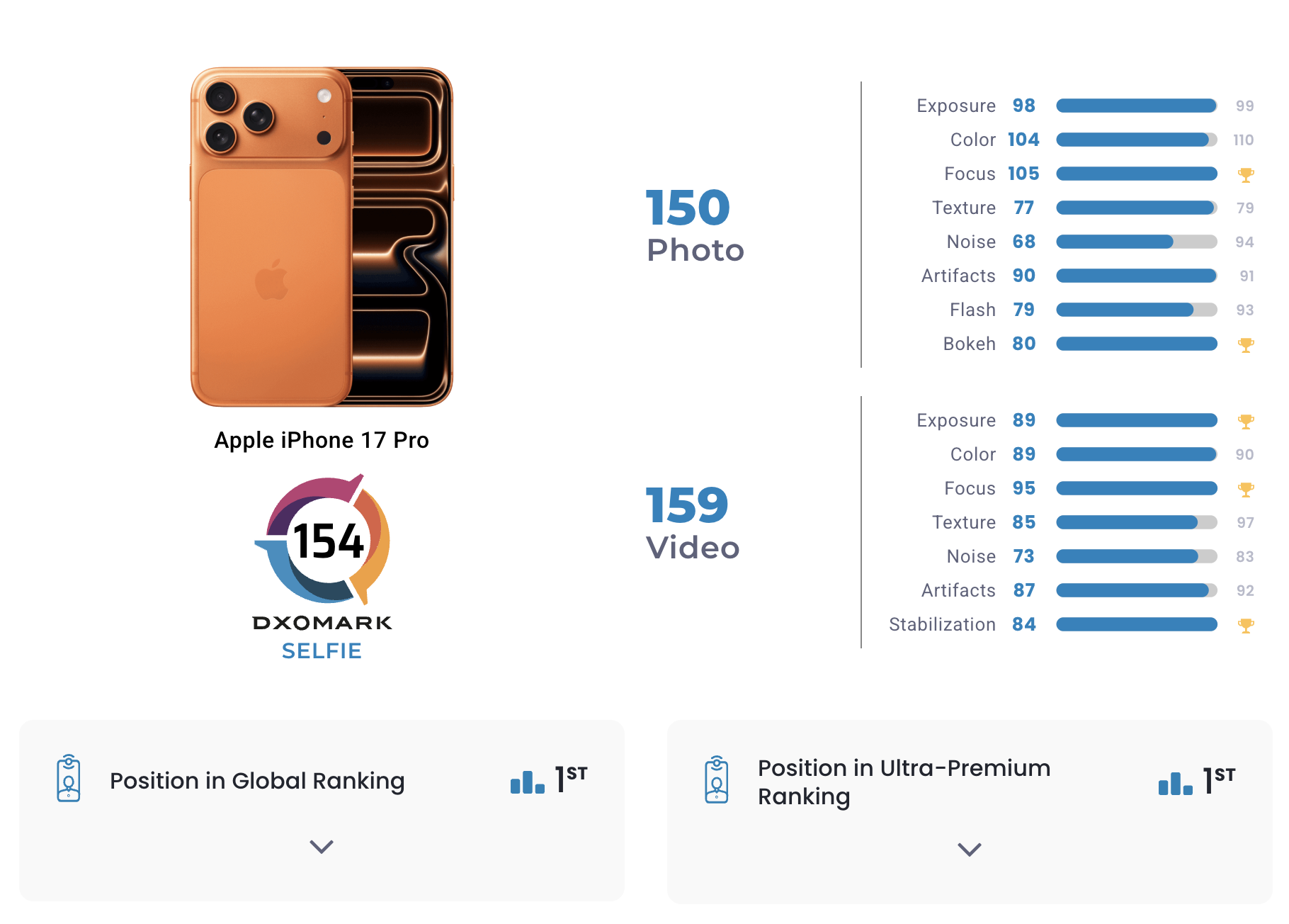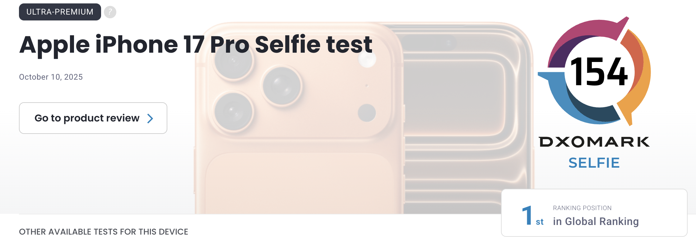 Лабораторія DxOMark протестувала нову фронтальну камеру з лінійки iPhone 17 та поставила її на перше місце у глобальному рейтингу. За підсумками тестування смартфон заробив максимальні на поточний момент 154 бали.