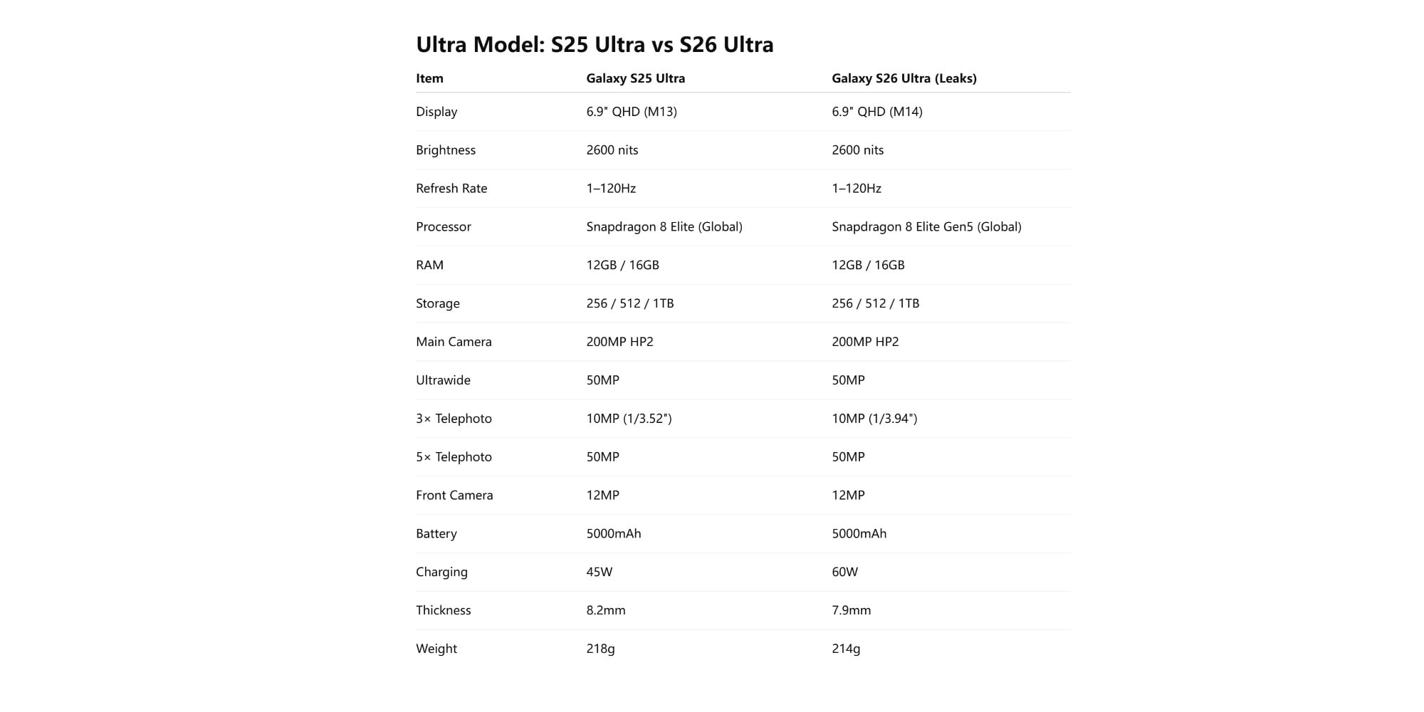 У Galaxy S26+ буде новий процесор і вага — він стане на 4 грами важчими. Що стосується флагмана Galaxy S26 Ultra, він буде оснащений чипом Snapdragon 8 Elite Gen 5, а потужність зарядки зросте з 45 Вт до 60 Вт. Він стане тоншим (7,9 міліметра замість 8,2) і легшим (214 грамів проти 218).