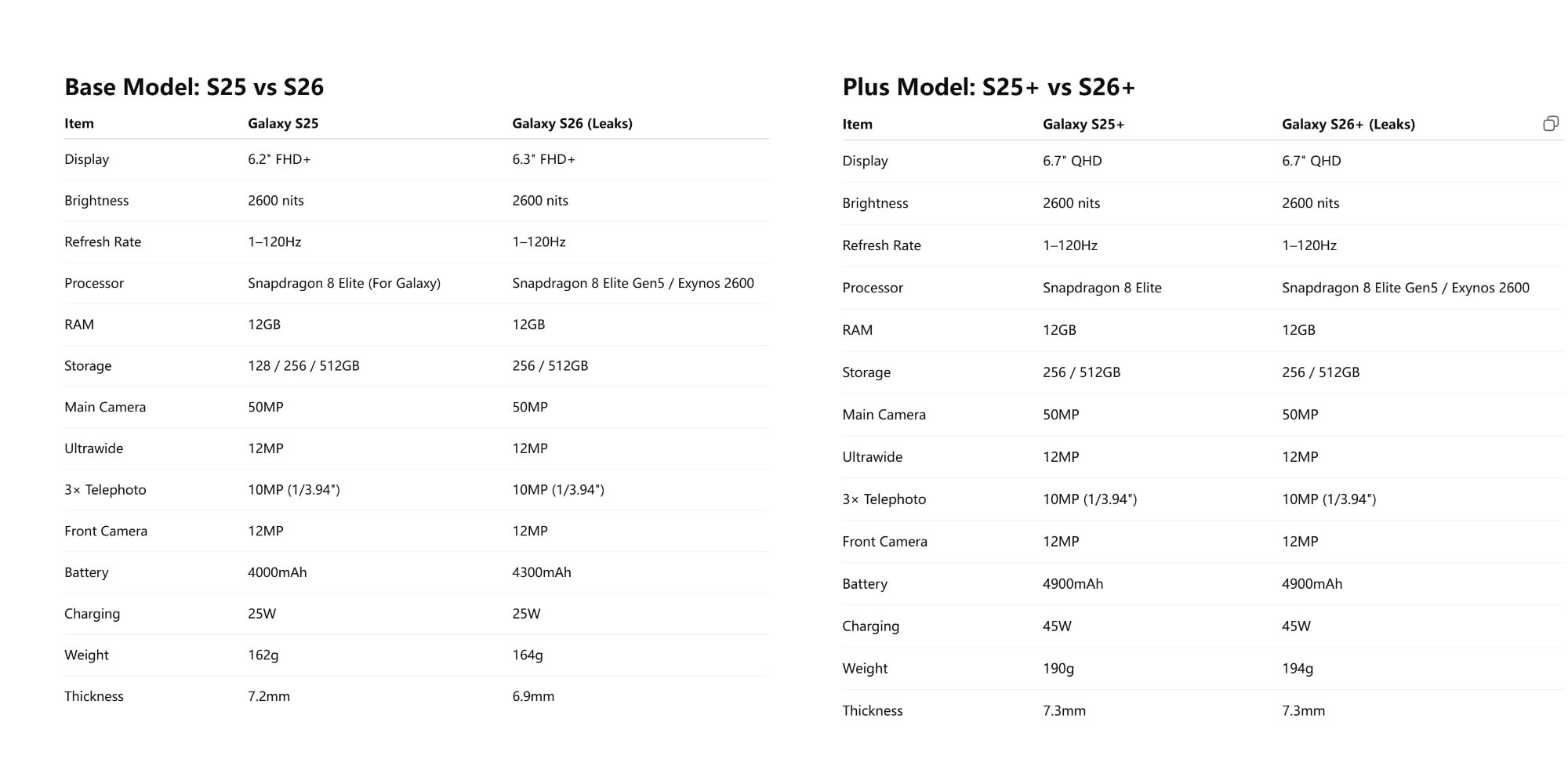 Базова модель Galaxy S26 отримає злегка збільшений дисплей розміром 6,3 дюйма (зараз 6,2 дюйма), новий процесор (Snapdragon 8 Elite Gen 5 або Exynos 2600) і батарею ємністю 4300 мАг замість 4000 мАг. При цьому вона стане тоншою — 6,9 міліметра проти 7,2. Роздільна здатність екрана, параметри камери та потужність заряджання залишаться без змін.