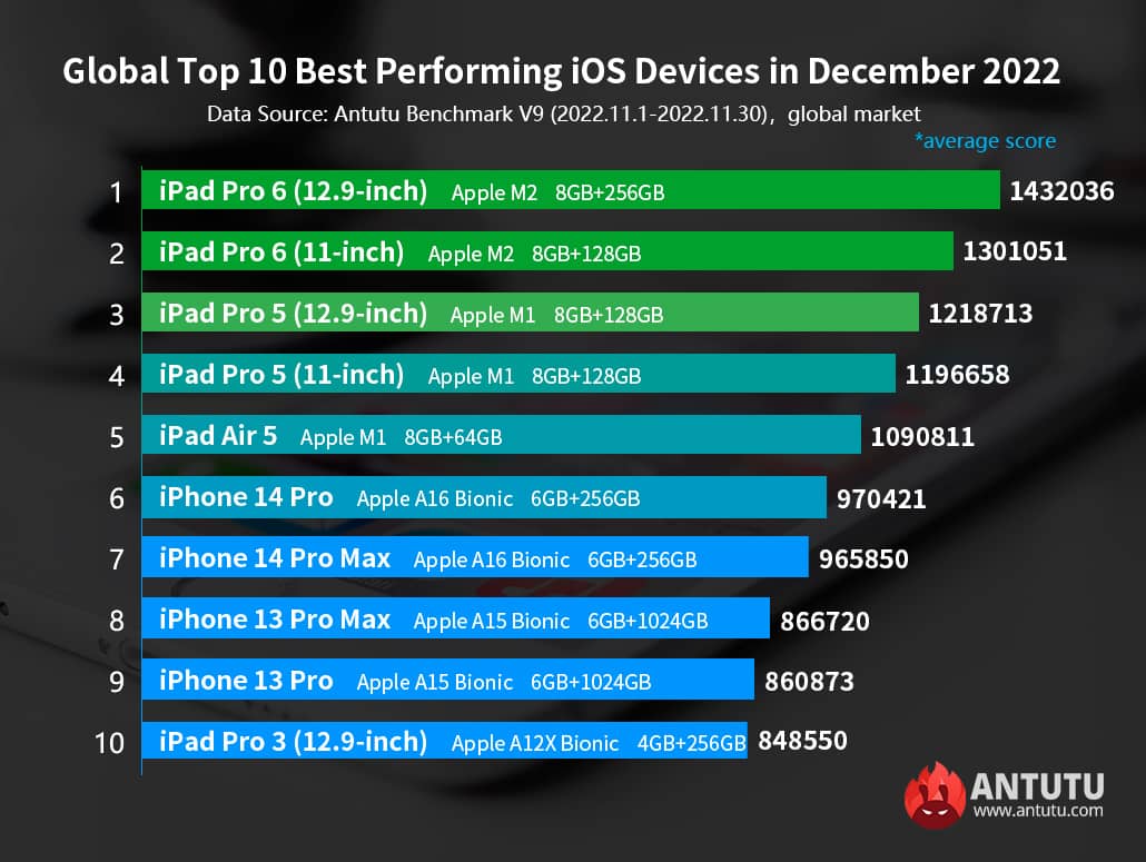На першому та другому місці залишаються дві моделі iPad Pro 6, випущені 18 жовтня 2022 року. Вони набирають приблизно на 300 000 балів більше, ніж iPhone 14 Pro і Pro Max, які посіли шосте та сьоме місця відповідно, і майже на 200 000 балів більше, ніж iPad Pro 5, який знаходиться на третьому місці. Ці два пристрої, безперечно, є найпотужнішими гаджетами «яблучної» компанії.