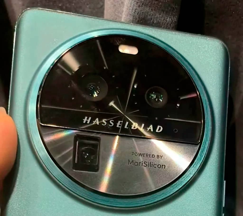 Пристрій матиме круглий блок камер, розділений на дві частини. Верхня виконана зі скла, нижня — із металу. Посередині видно брендинг Hasselblad, трохи нижче розташувався напис MariSilicon X, що говорить про наявність у смартфона фірмового нейронного процесора, який відповідає за обробку зображень.