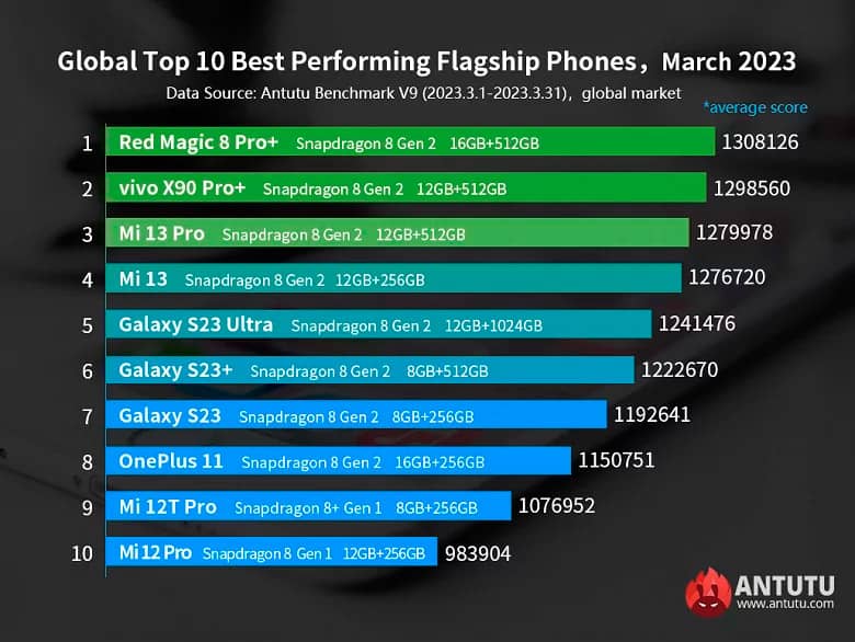 Вісім із десяти позицій займають моделі, робота яких будується на SoC Snapdragon 8 Gen 2. Лідером рейтингу став Red Magic 8 Pro+, який набрав 1 308 126 балів. На другому місці розташувався Vivo X90 Pro+ (1 298 560 балів), на третьому — Xiaomi Mi 13 Pro (1279978 балів).