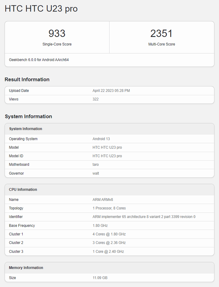 Згідно з Geekbench, HTC U23 Pro має 12 ГБ оперативної пам'яті та ОС Android 13. В одноядерному та багатоядерному тестах пристрій набрав 933 бали та 2351 бали відповідно.