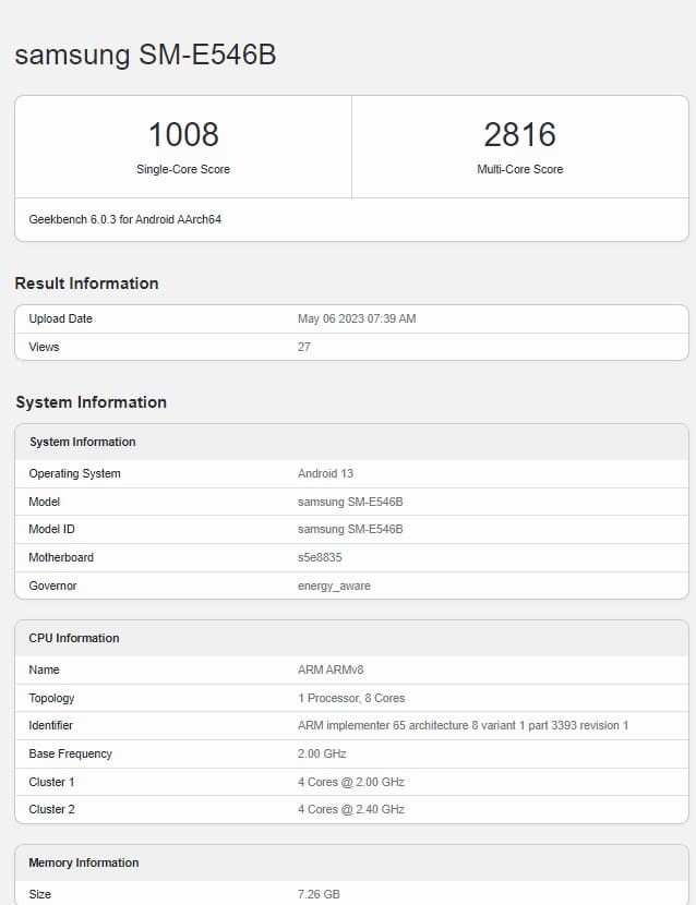 Тепер смартфон з'явився в Geekbench під номером моделі SM-E546B. За даними бенчмарку, Samsung Galaxy F54 5G справді отримає чіп Exynos 1380. Протестована версія смартфона оснащується 8 ГБ оперативної пам'яті, а керує ним операційна система Android 13.