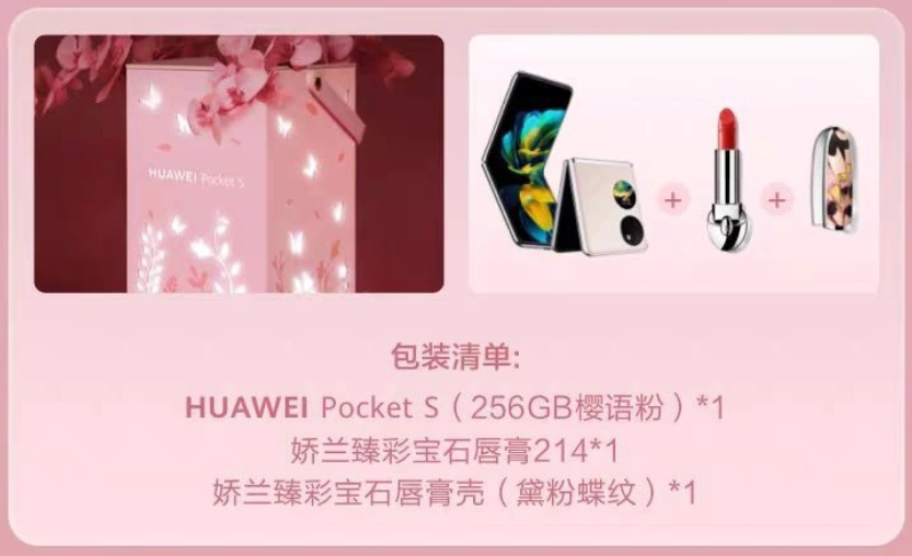 Комплект включає Huawei Pocket S у відтінку Sakura Pink та набір губної помади Guerlain Prestige Gem, що складається з помади Guerlain Prestige Gem Lipstick 214 та помади Prestige Gem Lipstick Cover Dai з малюнком «Рожевий метелик».