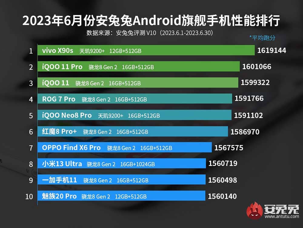 Бенчмарк AnTuTu опублікував рейтинги найпродуктивніших смартфонів на китайському ринку за підсумками червня 2023 року.