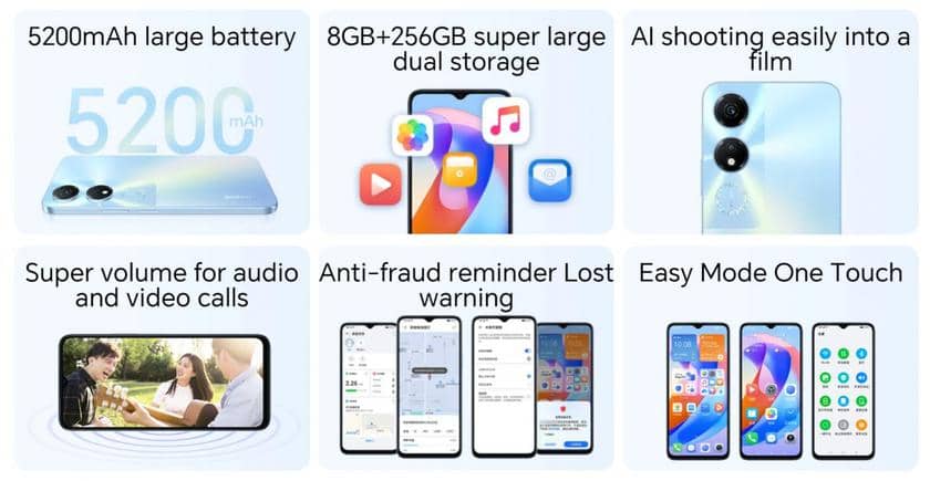 Honor Play 40 пропонує 6/8 ГБ оперативної пам'яті, 128/256 ГБ флеш-пам'яті, акумулятор ємністю 5200 мАг, Wi-Fi 5, Bluetooth 5.1, порт USB-C, сканер відбитків пальців збоку, NFC та стереодинаміки. Керує пристроєм прошивка Magic UI 7.1 на базі Android 13.