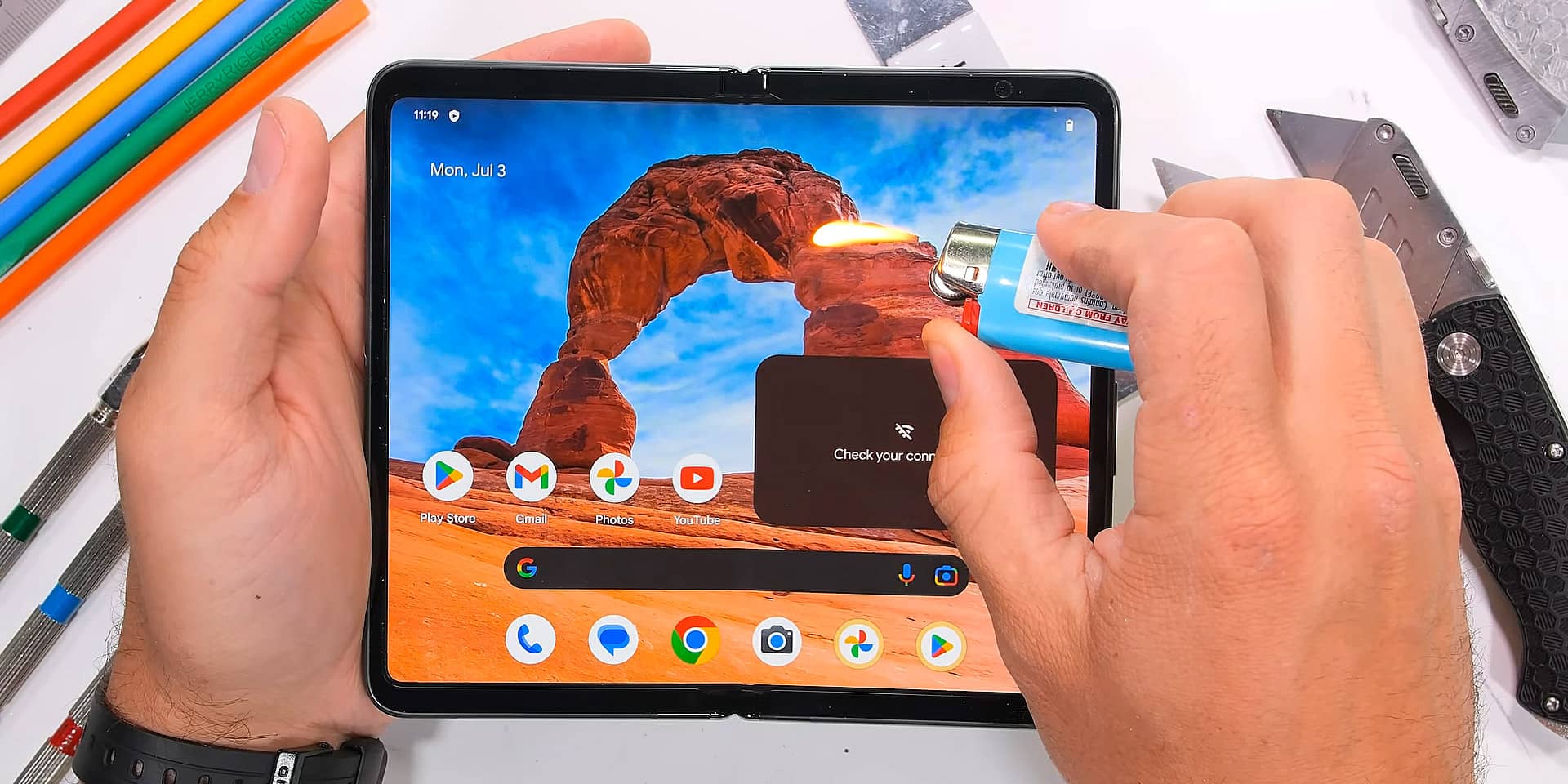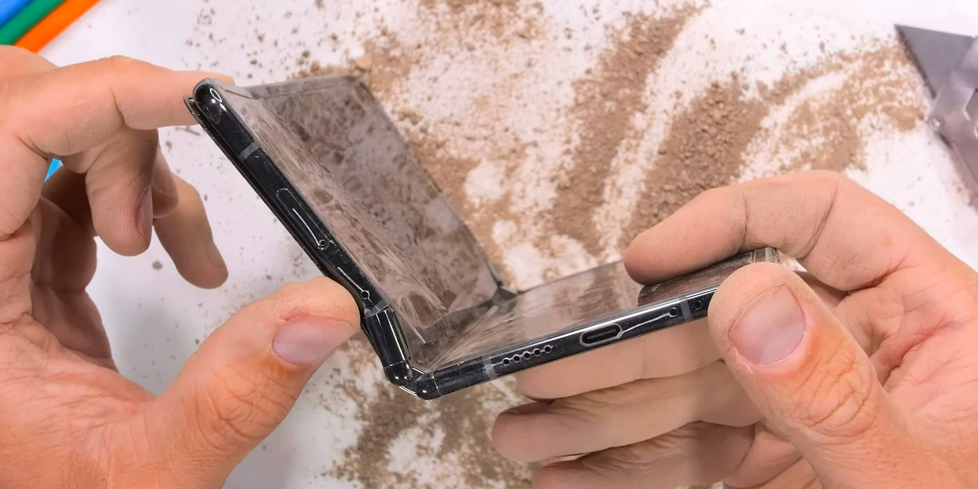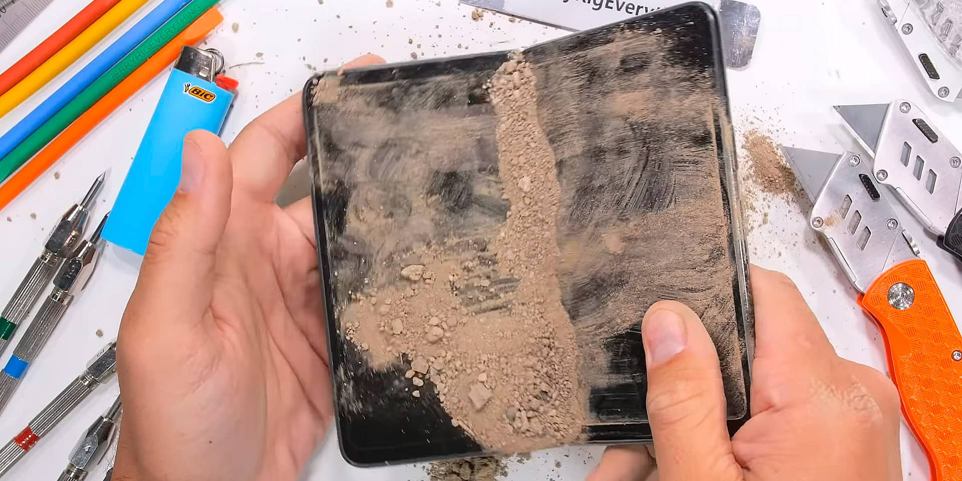 Він перевірив гаджет на стійкість до подряпин та вогню, спробував зігнути його, а також оцінив надійність шарніра за допомогою піску.
