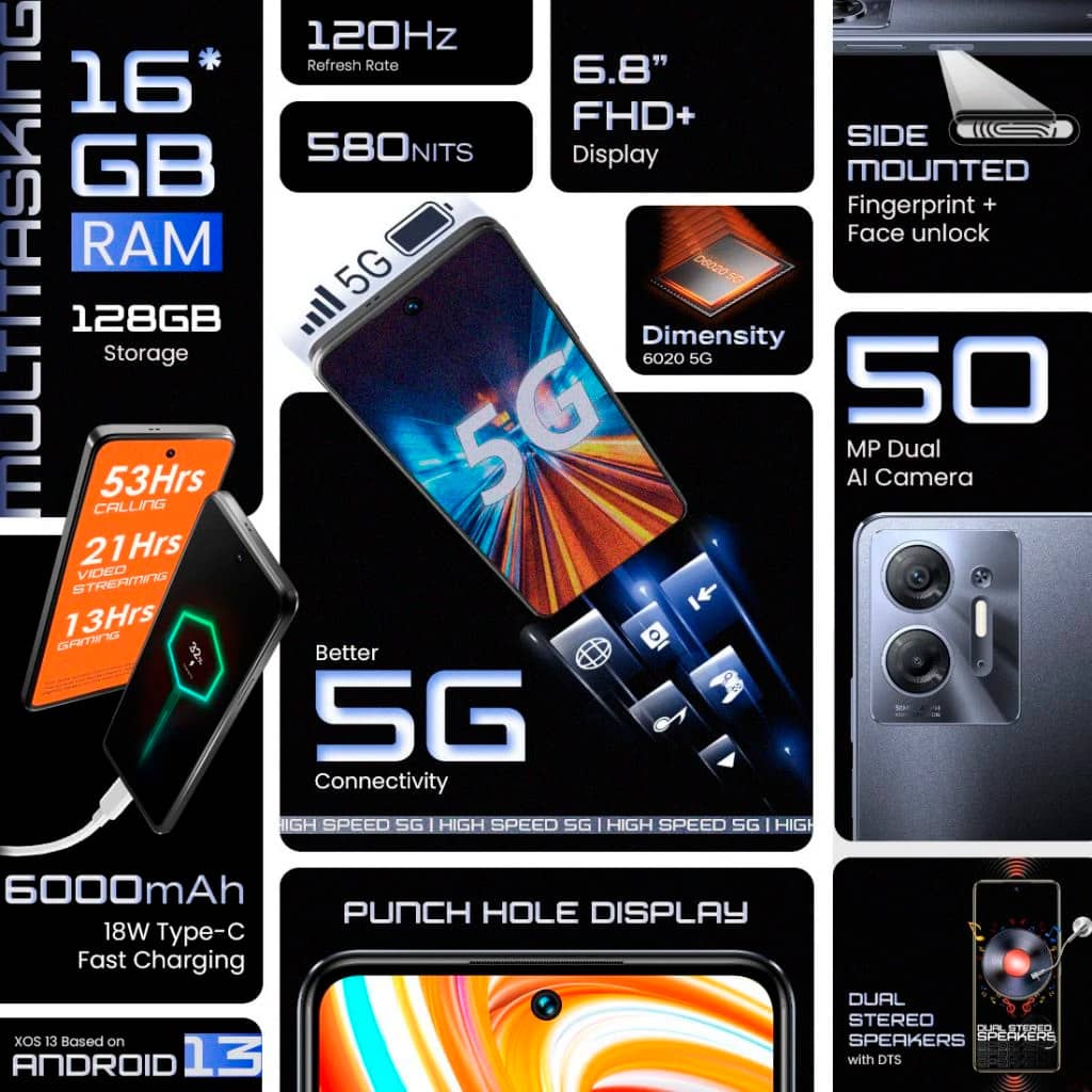 Infinix Hot 30 5G отримав 6,78-дюймовий екран IPS FHD+ з підтримкою частоти оновлення 120 Гц, процесор MediaTek Dimensity 6020, до 8 ГБ оперативної пам'яті (плюс до 8 ГБ віртуальної) та батарею на 6000 мАг з підтримкою зарядки потужністю 18 Вт. Основна камера на 50 Мп. Фронтальна — 8 Мп.
