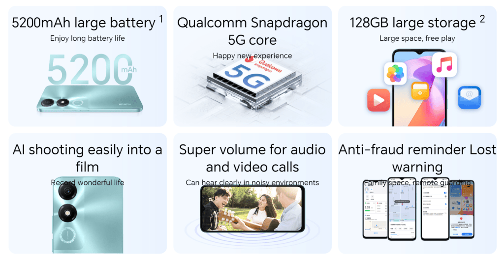 Телефон оснащено набором датчиків, звуковими ефектами Honor Histen, портом Type-C, роз'ємом для навушників 3.5 мм.