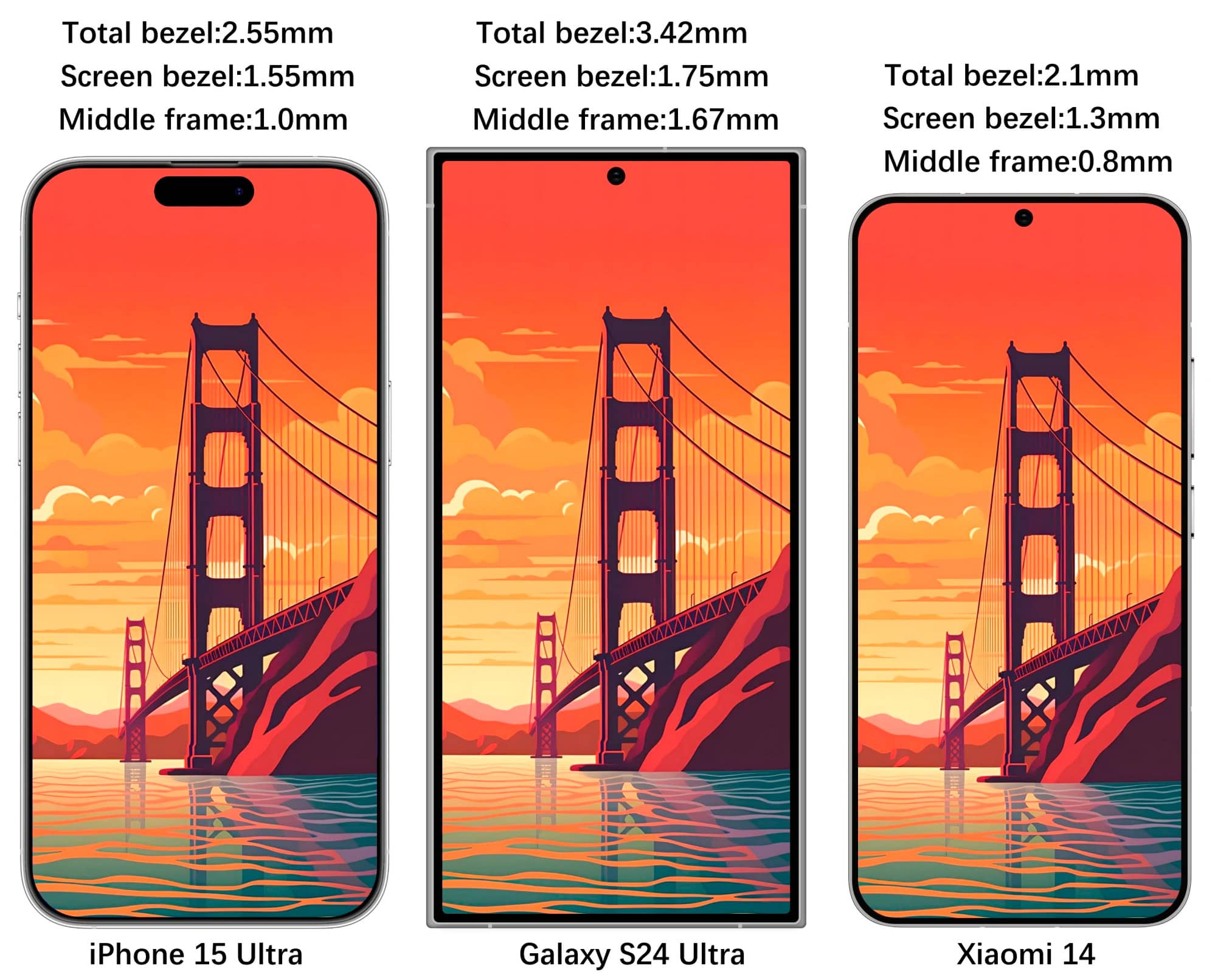 Разом з тим Ice Universe опублікував кілька порівняльних рендерів, на яких новий Galaxy S24 Ultra порівнюється з майбутніми iPhone 15 Ultra та Xiaomi 14. У них повинні бути дуже вузькі рамки екрана.